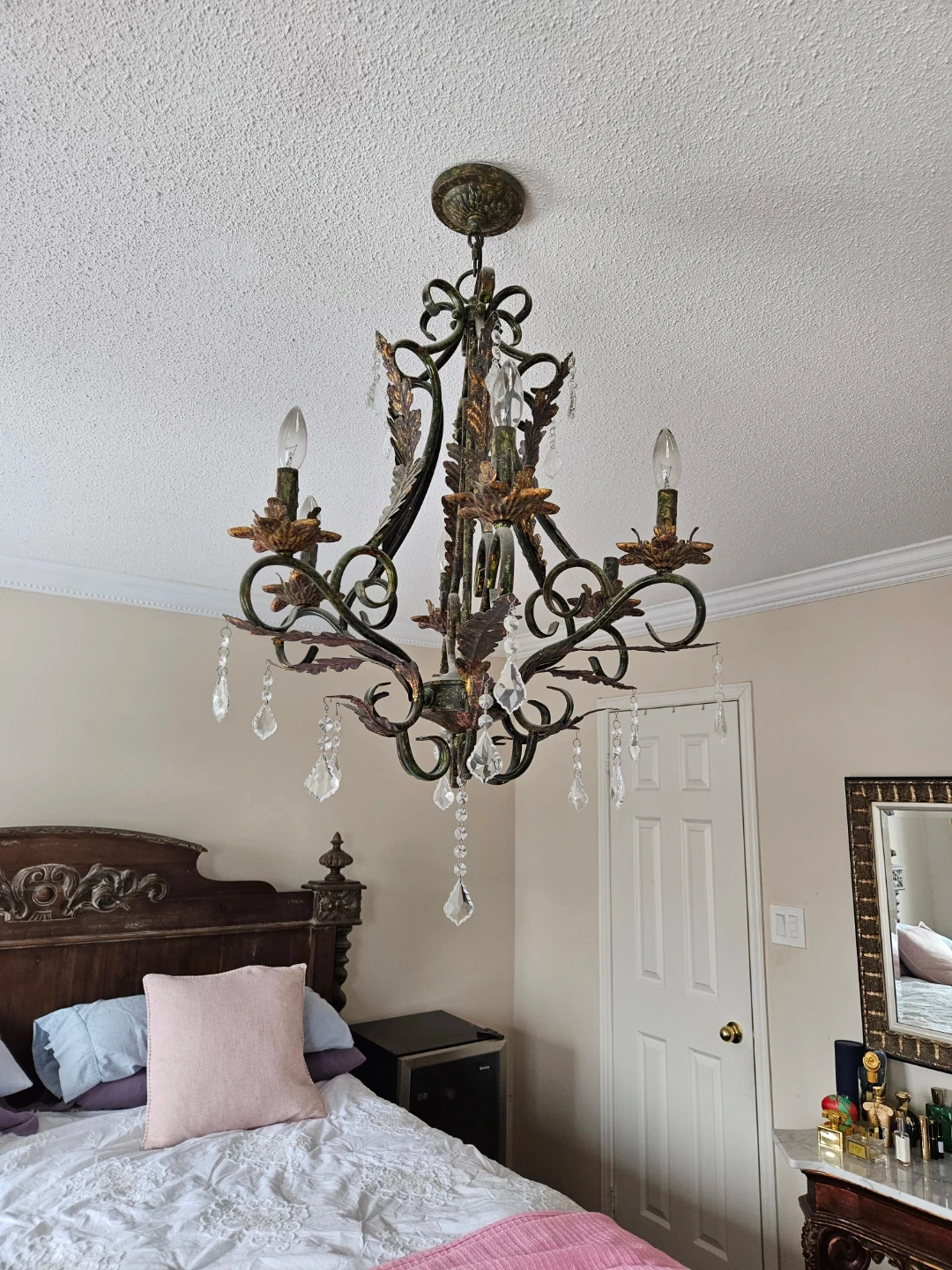 Selling a vintage-style chandelier that would add a unique touch to any room! It features a beautiful wrought iron design with leaf accents and hanging crystal