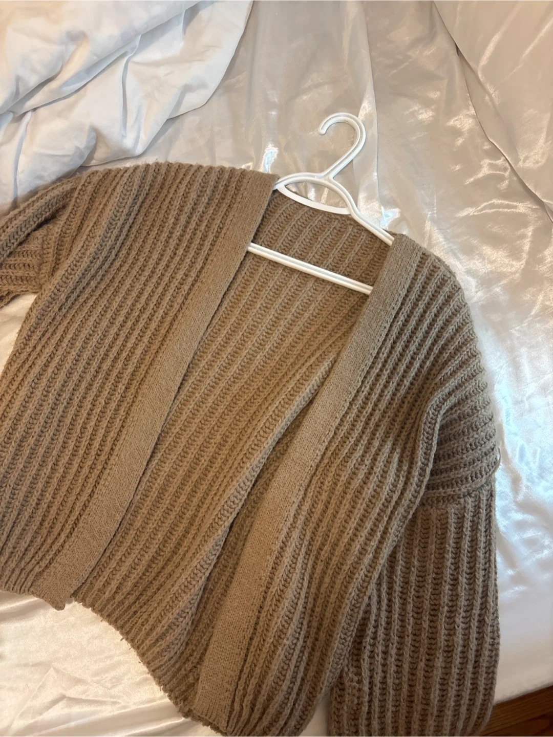Selling a cozy beige knit cardigan! It's in great condition and perfect for layering during the cooler months. The chunky knit and relaxed fit make it super comfy and stylish. It's a versatile piece that can be dressed up or down, so it's a great addition to any wardrobe
