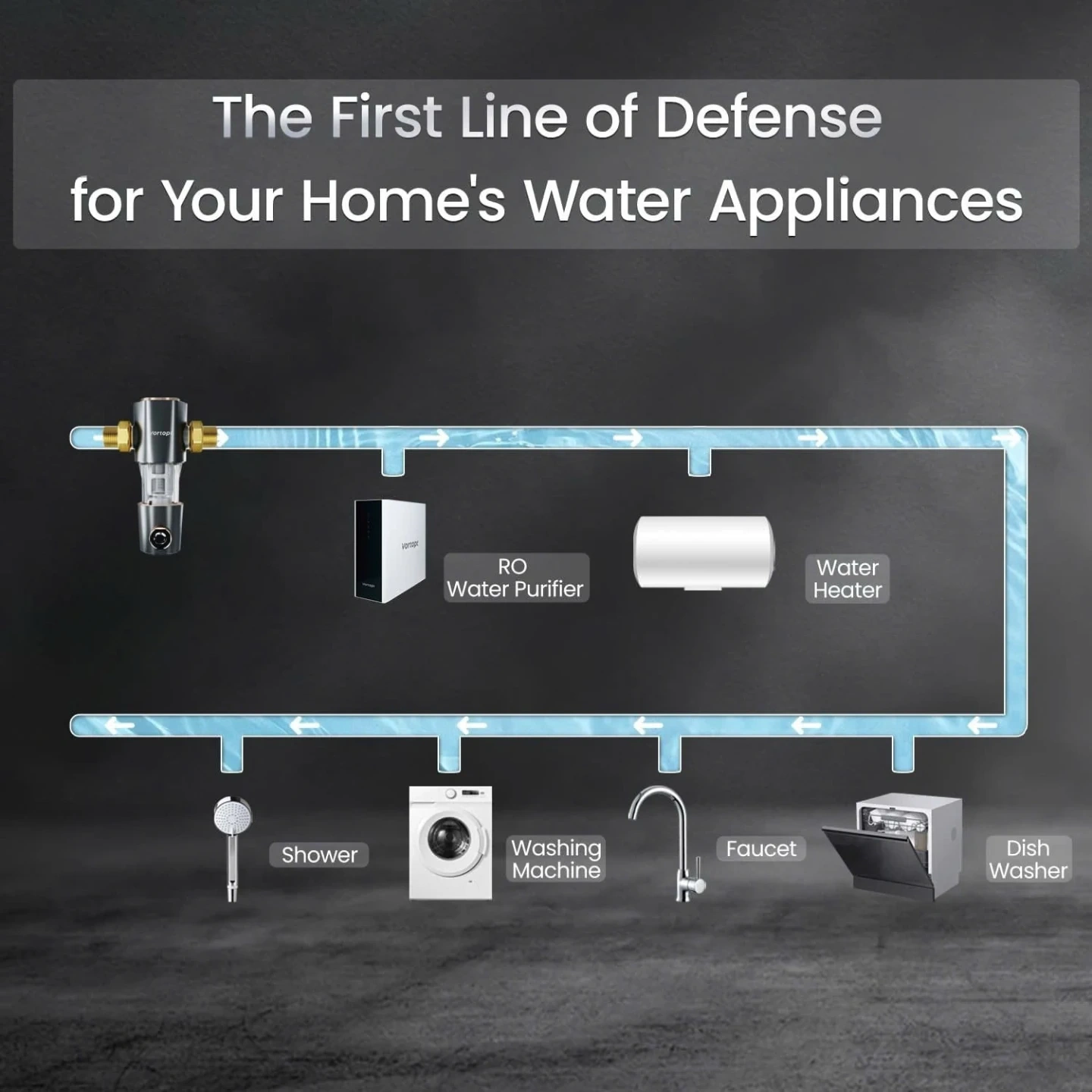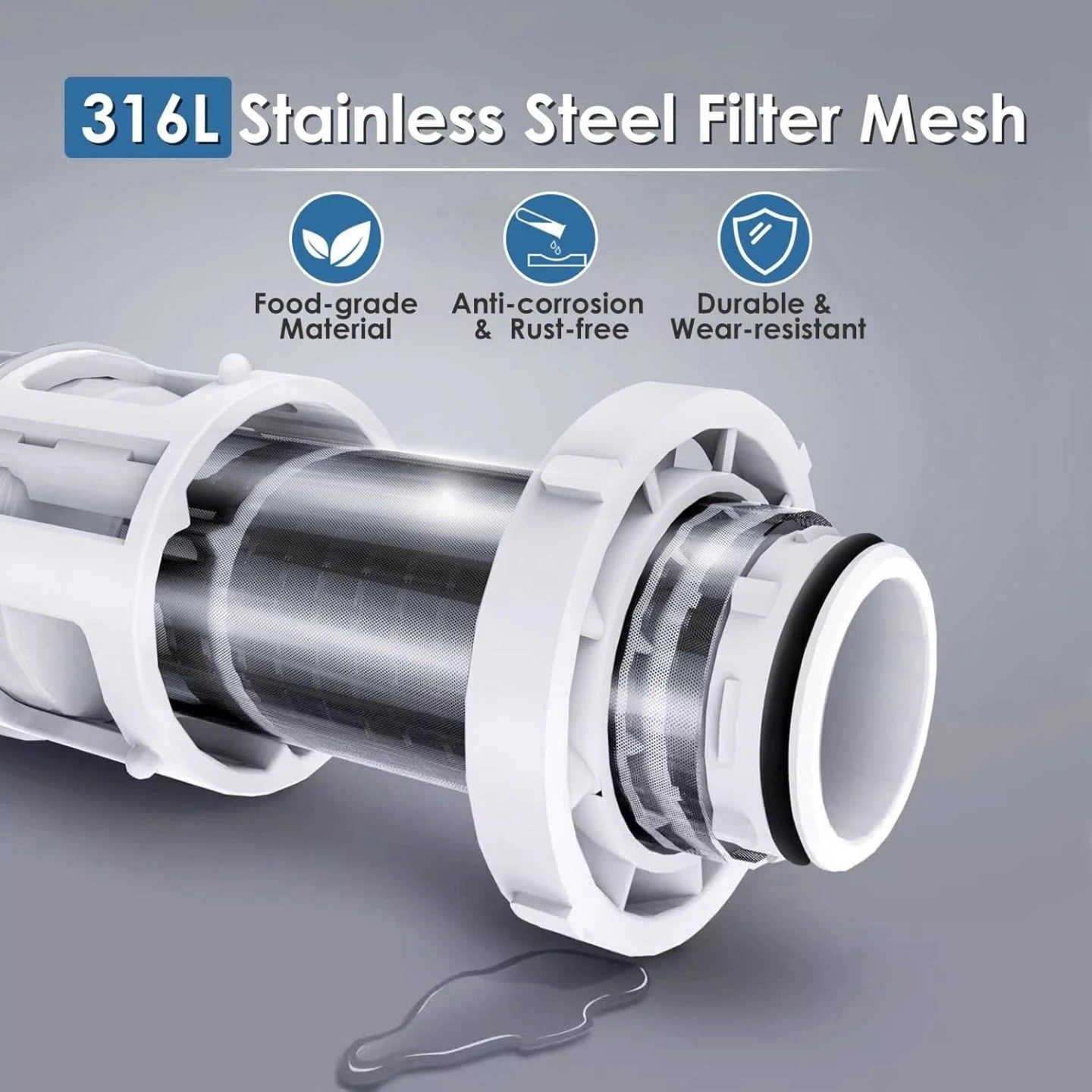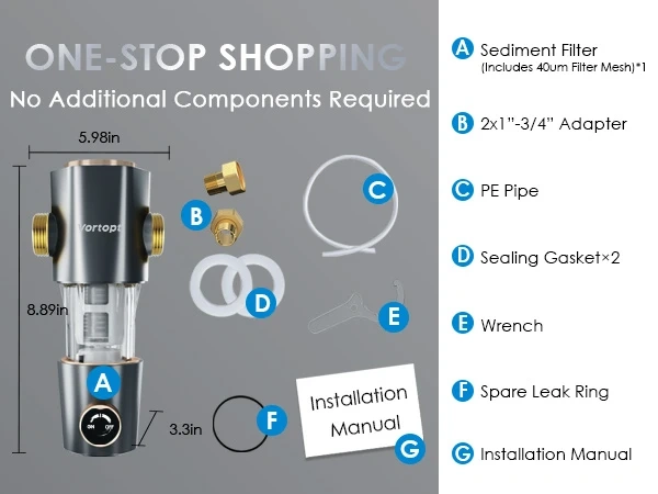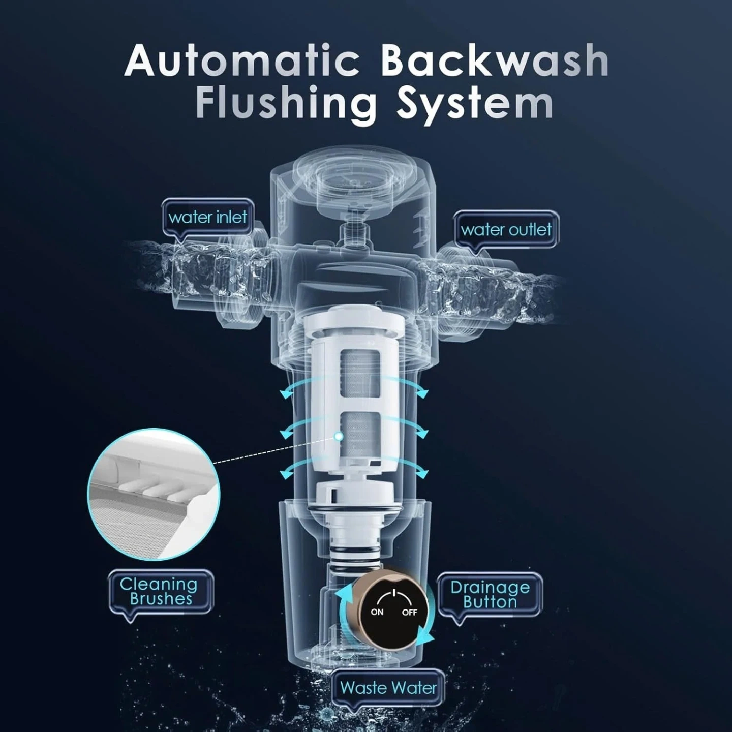 This Vortopt Q50 whole house spin down water filter is designed to be the first line of defense for your home's water appliances. It features an automatic backwash flushing system and a hydrodynamic scraping mesh for automatic cleaning. The filter has a lead-free design to ensure the safety of your water. It has been through 200,000 water hammer tests, ensuring it is anti-burst and anti-crack. It also boasts a BPA-free material and -30° frost resistance