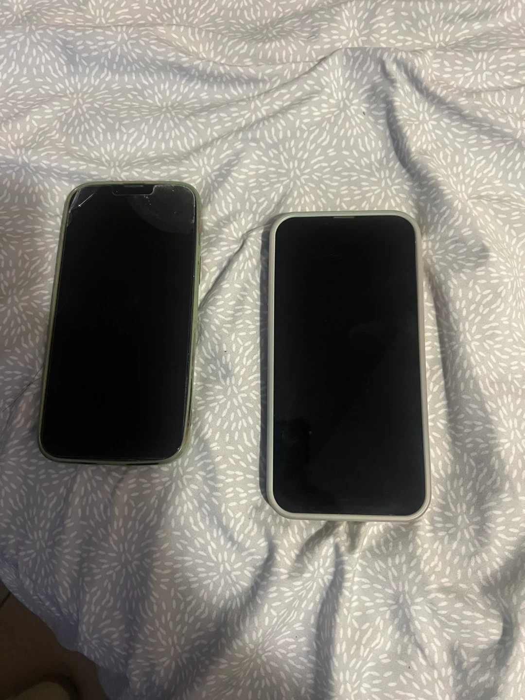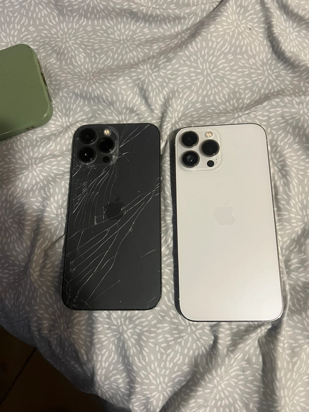Selling an iPhone 13 Pro with a cracked screen and a working iPhone 13. Both phones are in used condition.