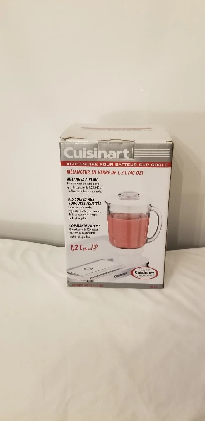 Selling a brand new Cuisinart 40-oz (1.2L) glass blender attachment! It's still in its original box and has never been used. This stand mixer attachment is perfect for full-size blending, soups, and smoothies. It also features precision control with 12 speeds for perfect results every time