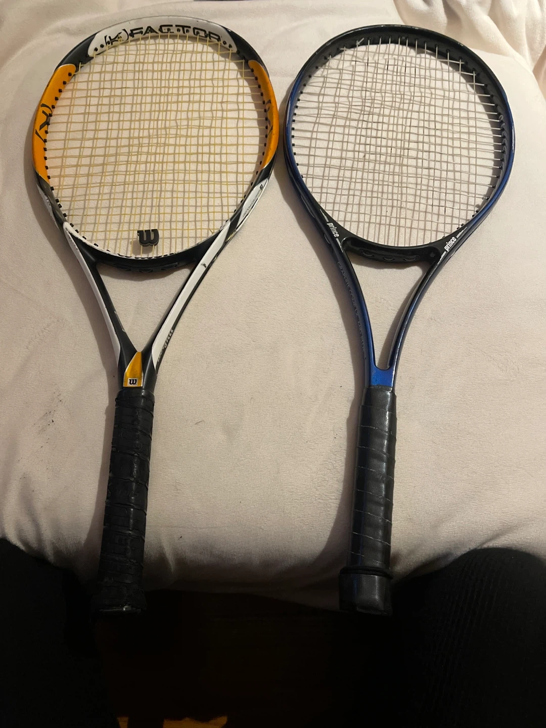Selling a Wilson and Prince tennis racquet together! The Wilson racquet is a [K] Factor and the Prince racquet is blue. Great for anyone looking to get into tennis or upgrade their current gear