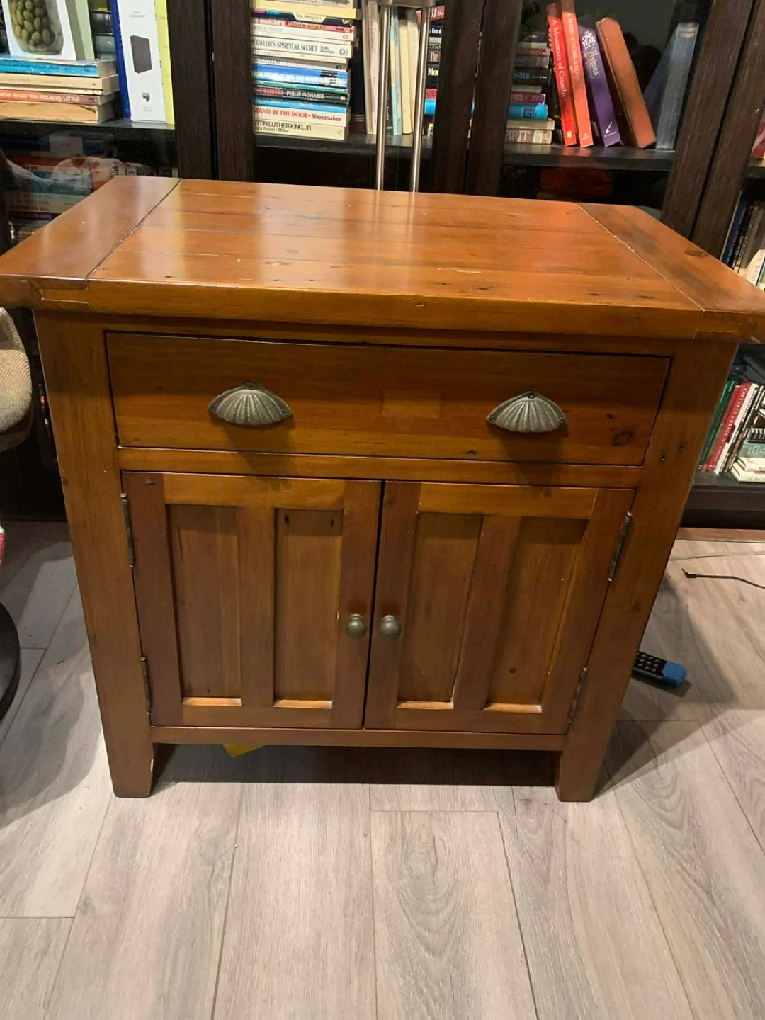 Here's a lovely wooden side table with a cabinet for extra storage! It features a drawer and a cabinet with doors, perfect for keeping things organized. The wooden finish adds a warm touch to any room. It's in great condition and ready for a new home!