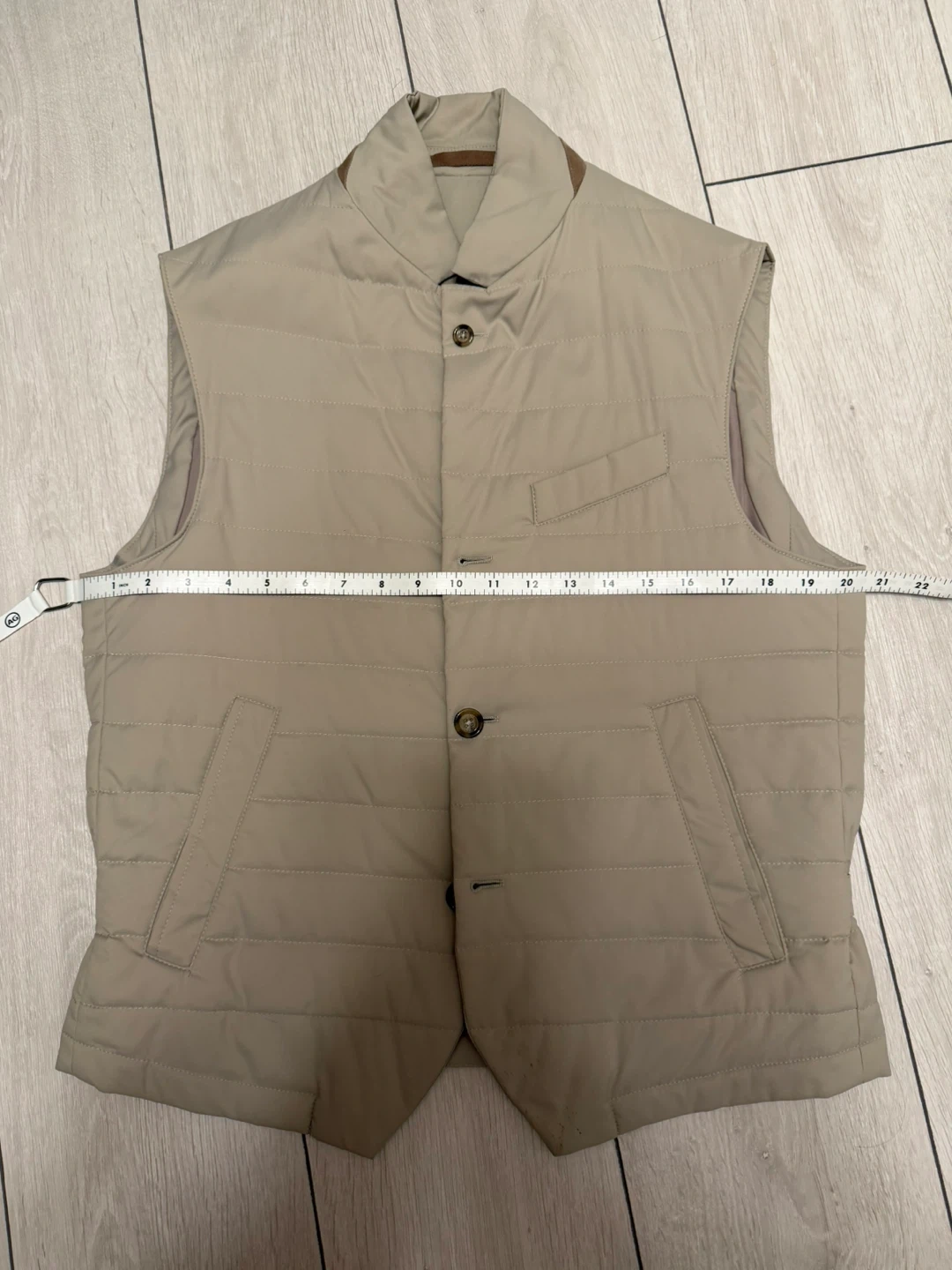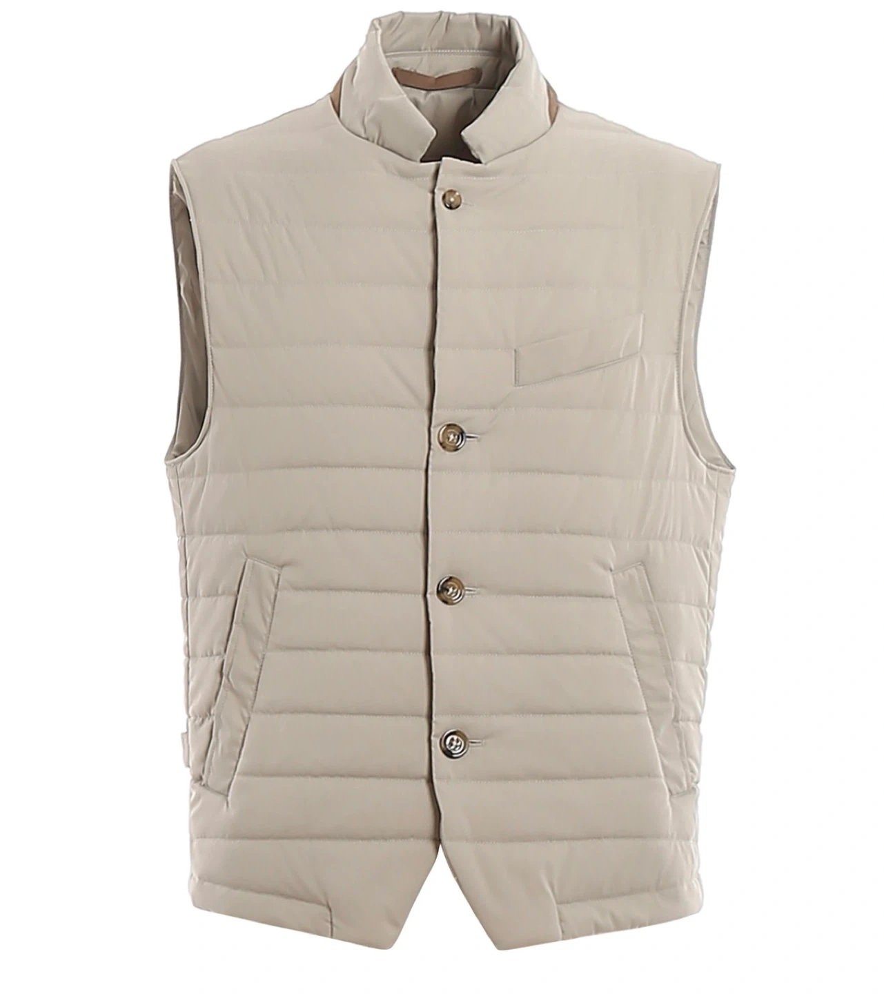 Details: Quilted matte nylon padded gilet; classic lapels; button fastening; sleeveless design; two snap side pockets; rear adjustable strap for fit; made in Italy.
