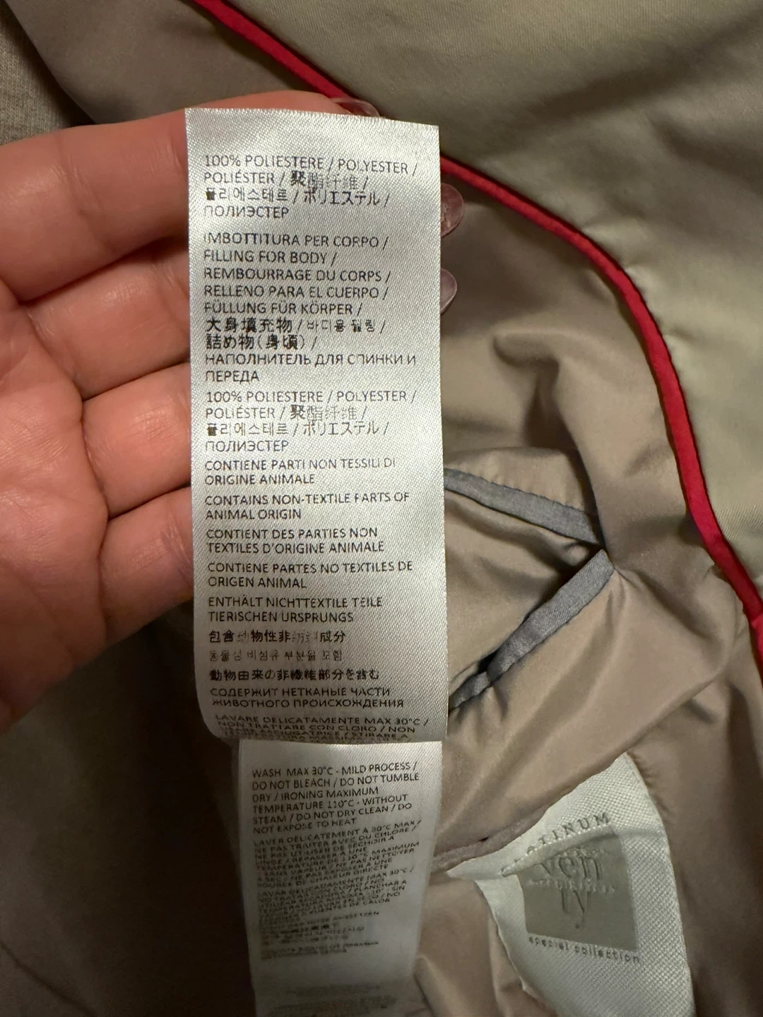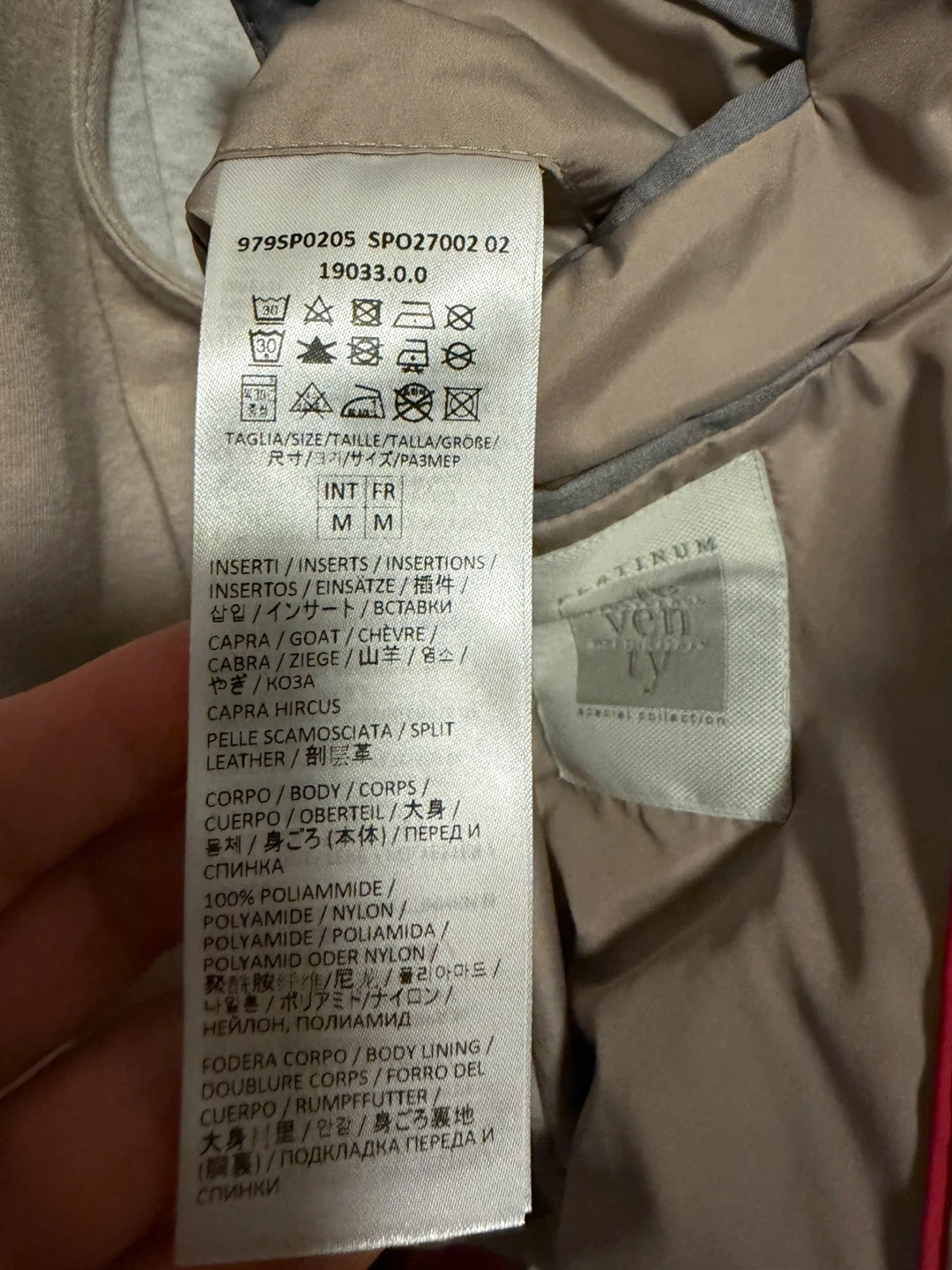 Material (per label): Shell 100% polyamide; lining 100% polyamide; filling 100% polyester; inserts goat suede leather (Capra hircus); contains non-textile parts of animal origin.