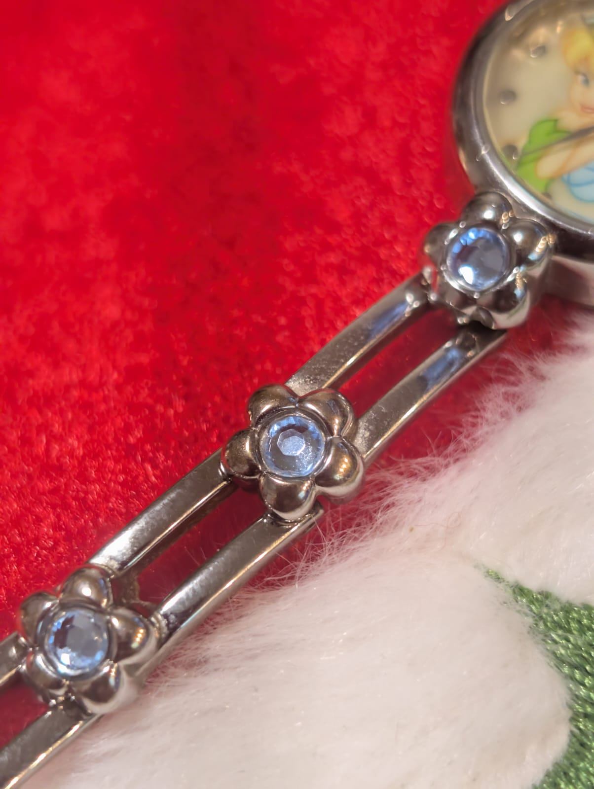 Sparkle with a touch of Neverland! This elegant Tinker Bell watch blends high-quality craftsmanship with whimsical Disney style. The silver-tone bracelet is uniquely designed with a row of blue flowers and crystals, making it look as much like a piece of jewelry as a functional timepiece.