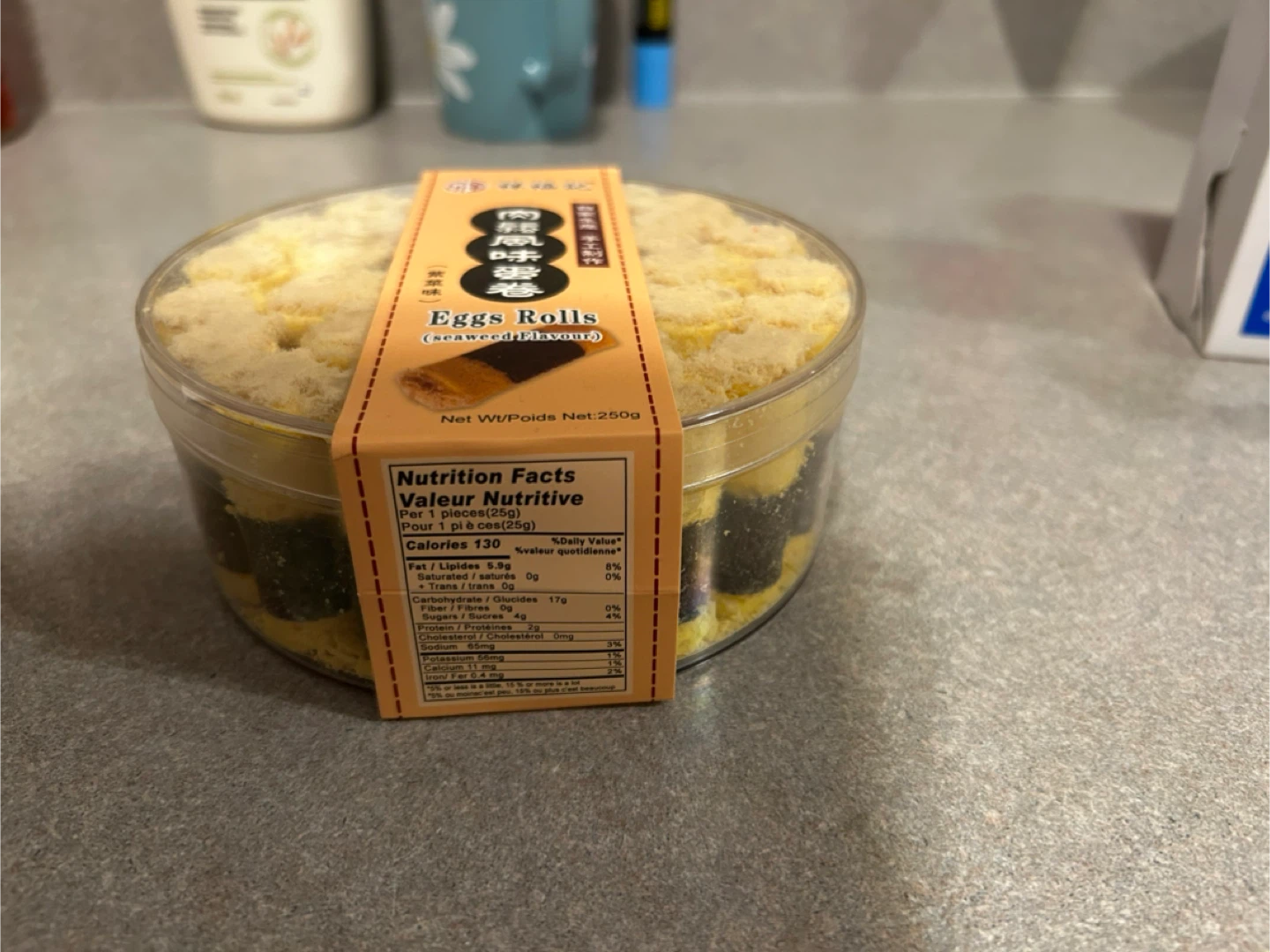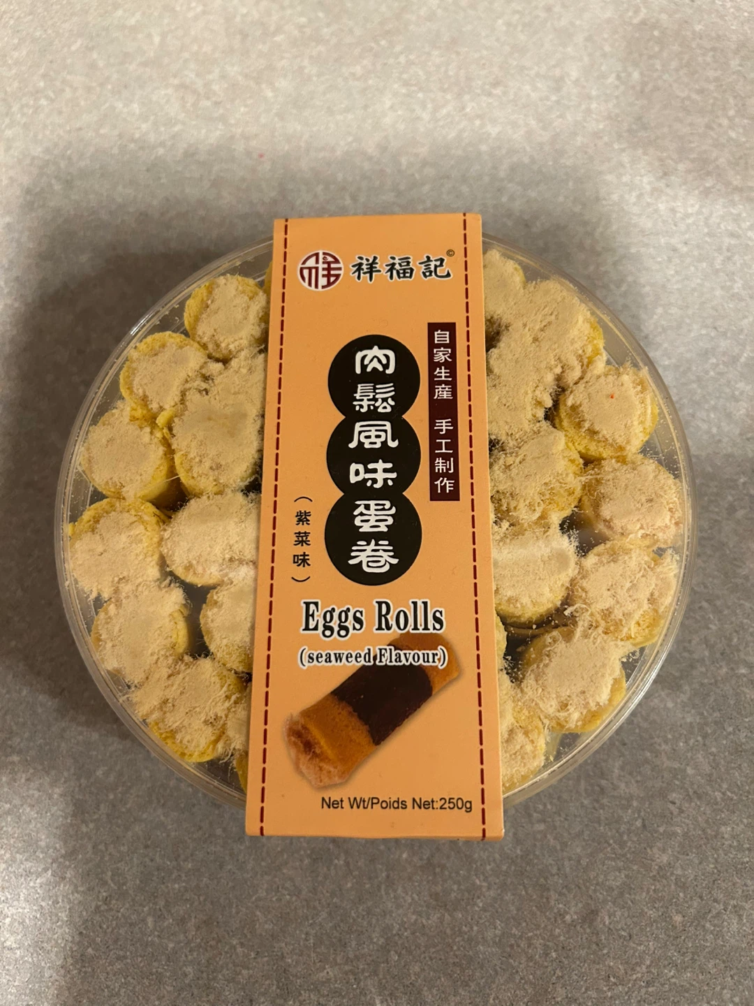Selling a container of egg rolls with seaweed flavour. Net weight is 250g. Great for a snack!