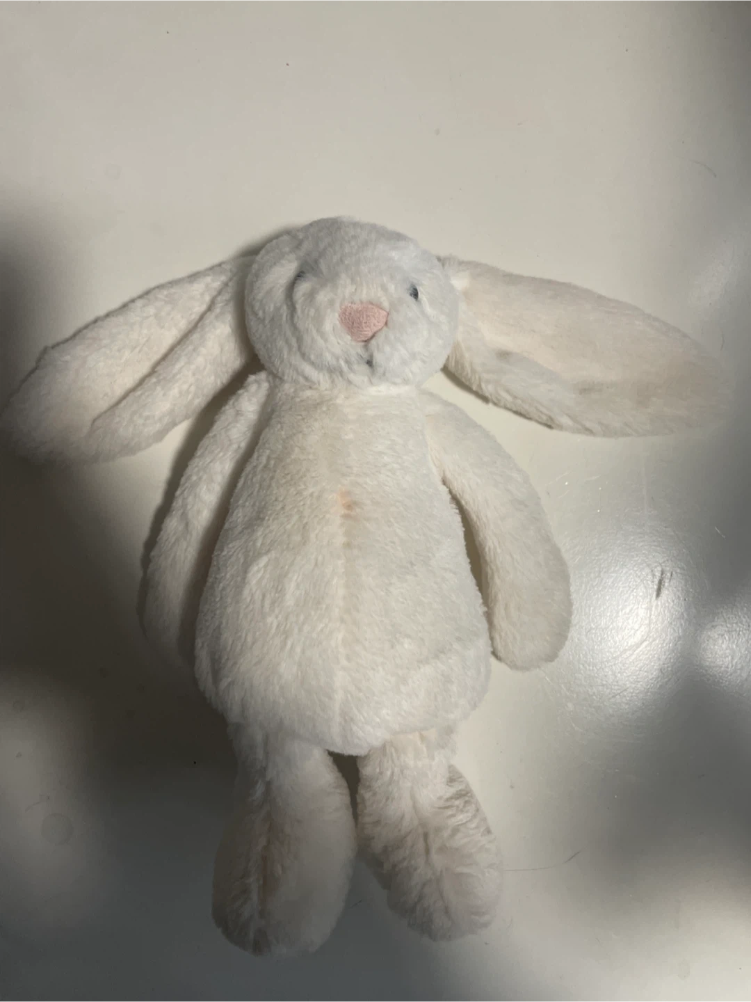 Selling a gently used Jellycat Bashful Cream Bunny. It's a super soft and cuddly plush toy! It has a small stain on the front.
