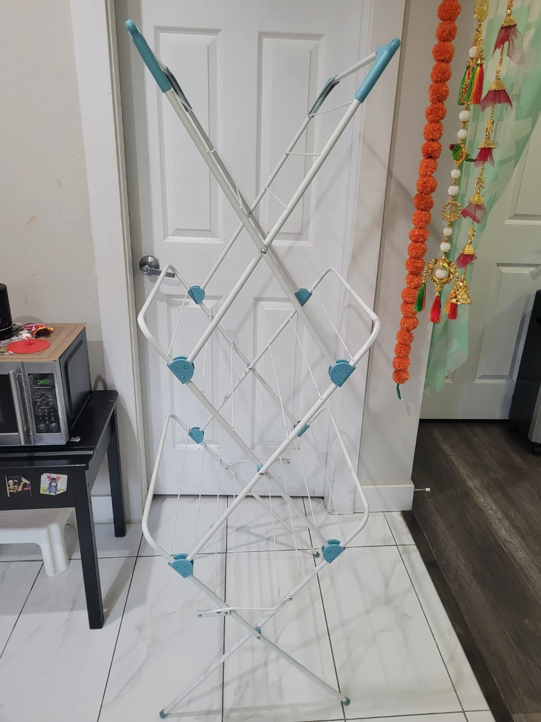 Selling a folding clothes drying rack in excellent condition. It's white with blue accents and folds up for easy storage. Great for saving space and drying clothes indoors!