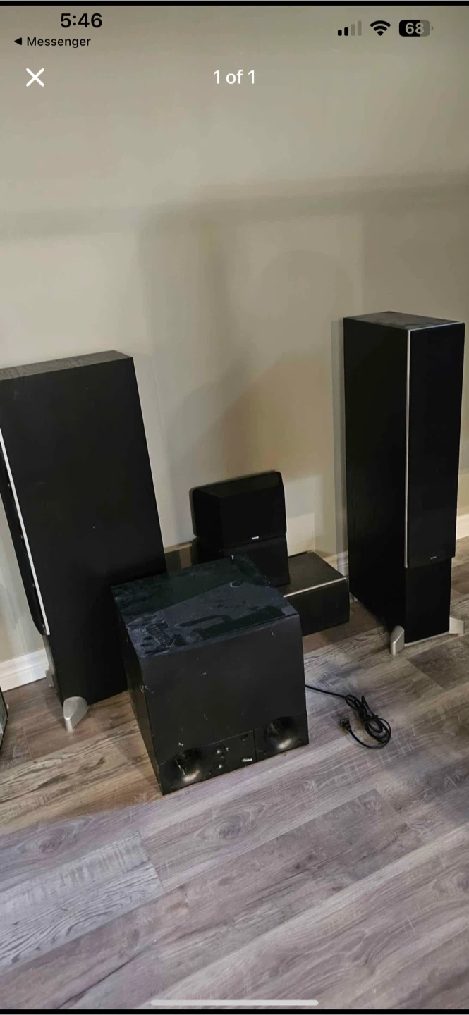 Selling a set of Energy home theatre speakers. Includes two tall speakers, two smaller speakers, a centre speaker, and a subwoofer. They have some wear and tear, but still sound great!