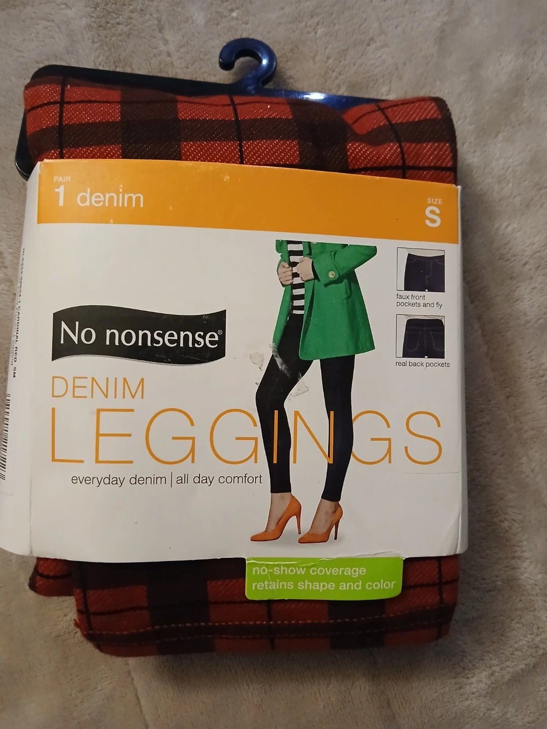 Selling a pair of new No Nonsense denim leggings. They are size small and have a fun red and black plaid pattern! These leggings feature faux front pockets and fly, along with real back pockets. They also offer no-show coverage and retain their shape and color