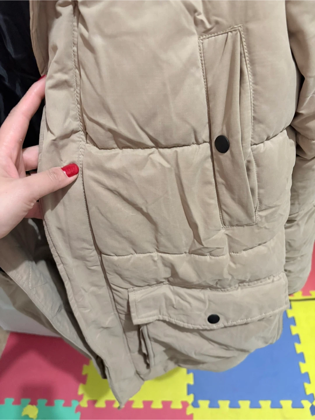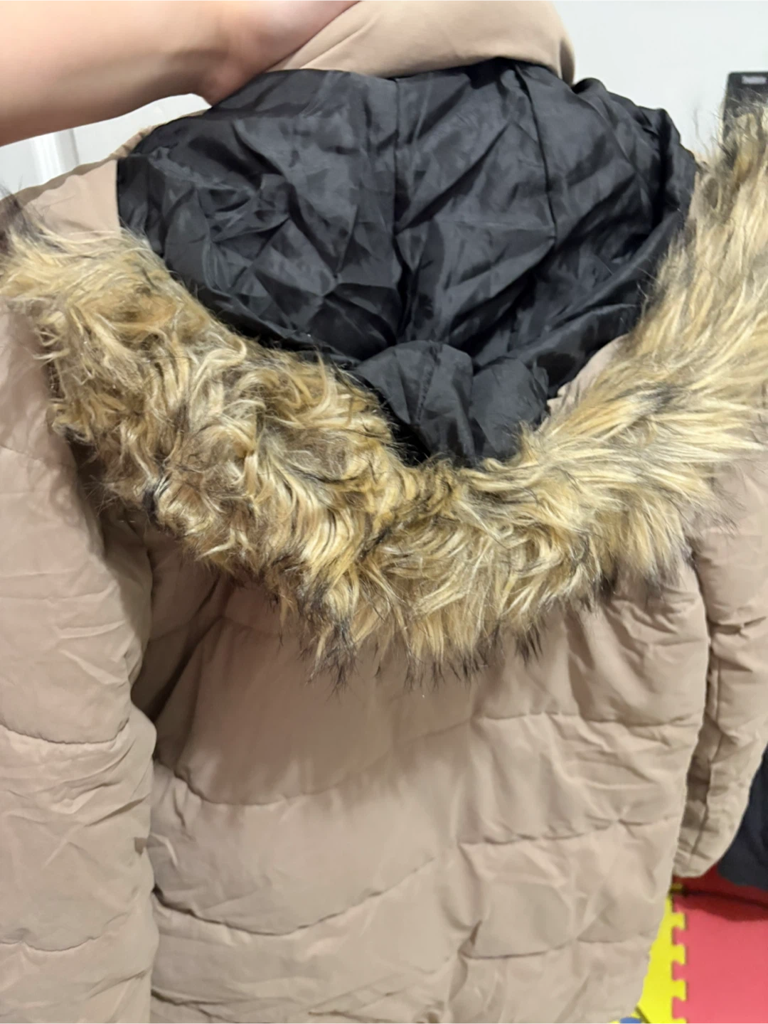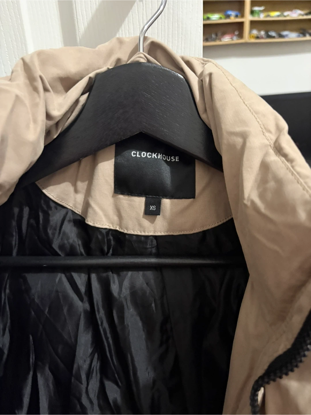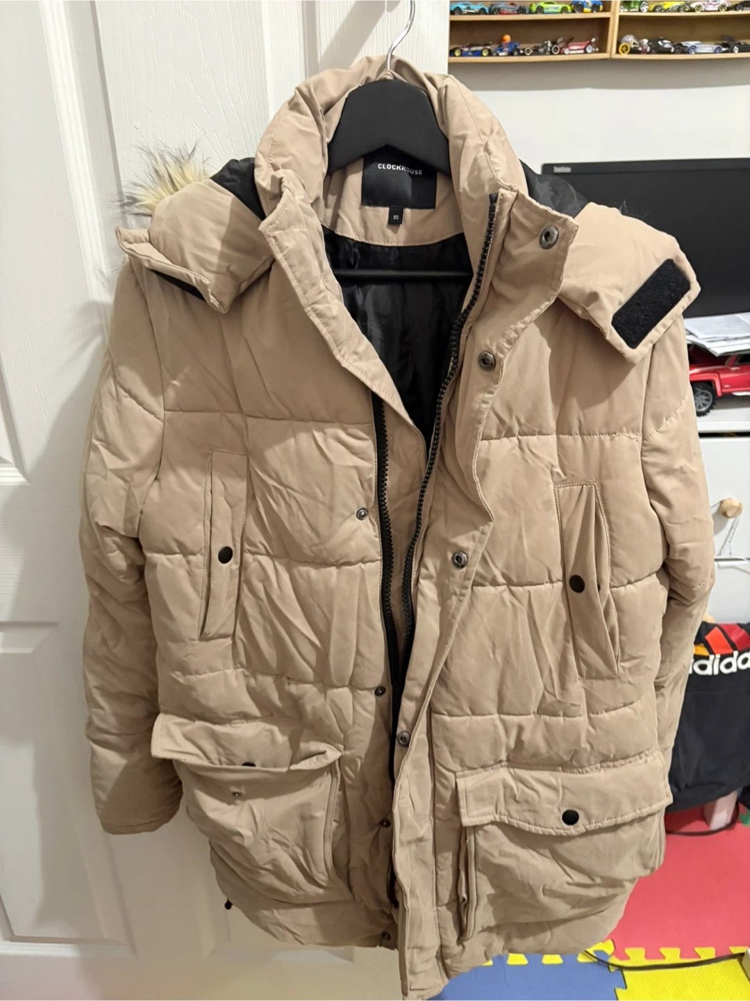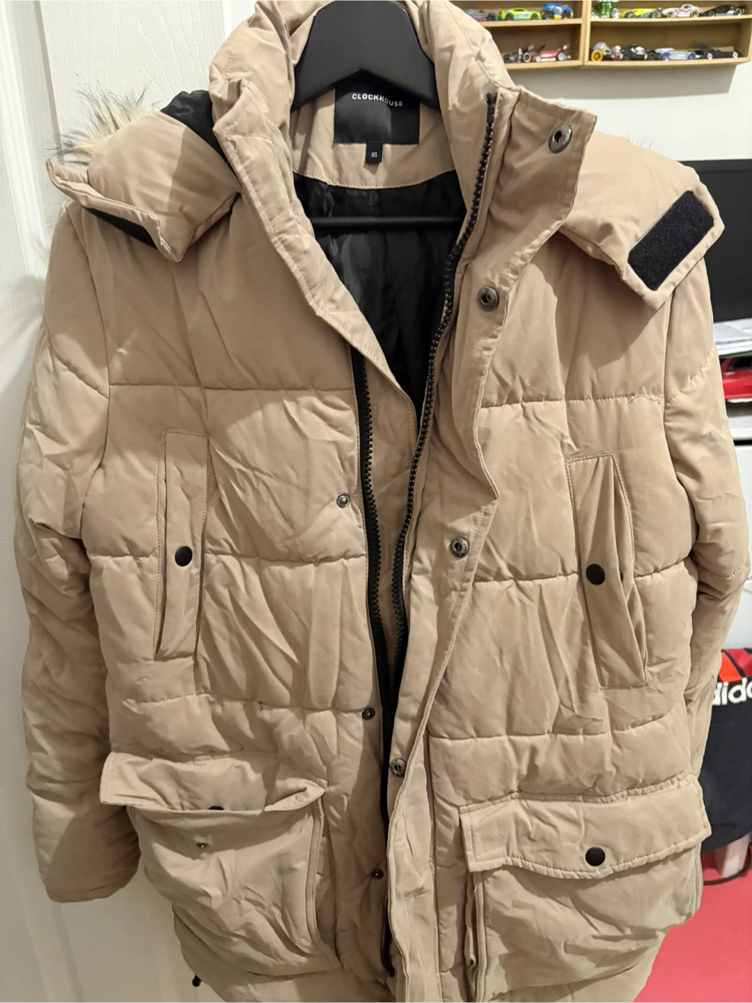 Selling a Clockhouse puffer jacket in size XS-Small. It's in great shape and ready for those chilly days! The jacket features a faux fur hood and a stylish design. Perfect for staying warm and looking good.