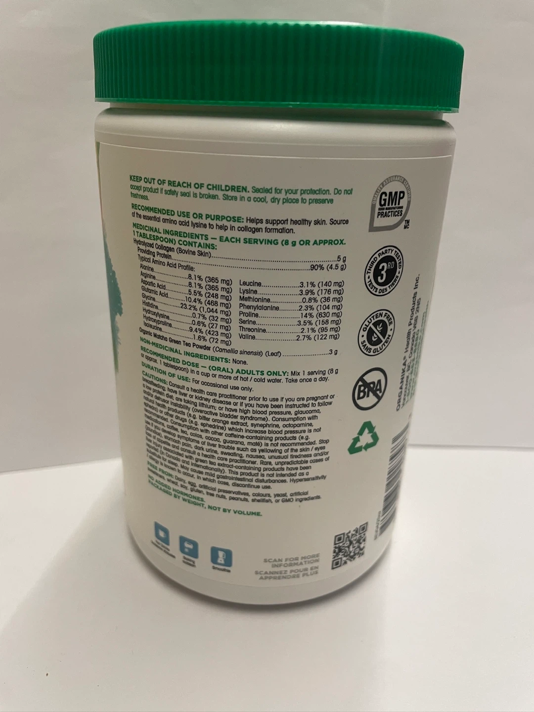 Selling a container of Organika Enhanced Collagen Protein with Matcha Green Tea Powder. This vitality blend contains hydrolyzed collagen peptides and provides 31 day supply. It supports healthy skin and is a source of the amino acid lysine to help in collagen formation. Net weight: 250g