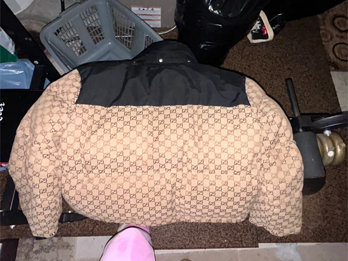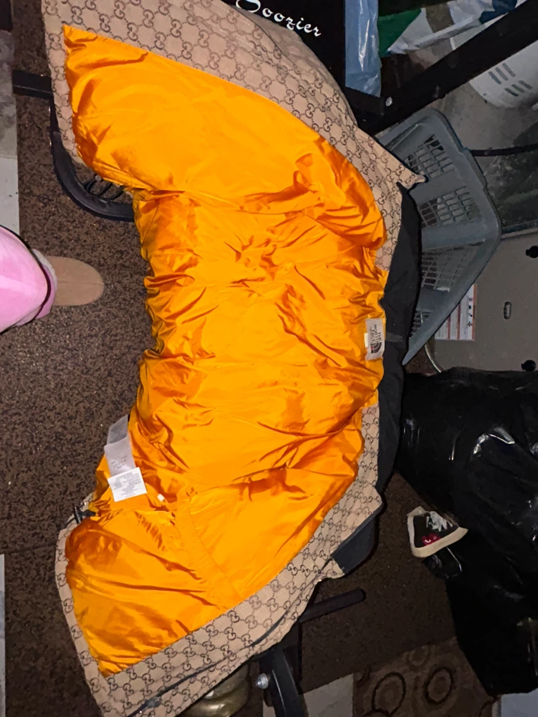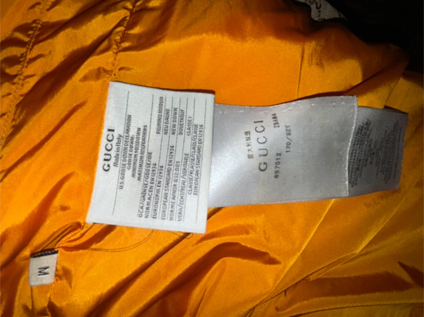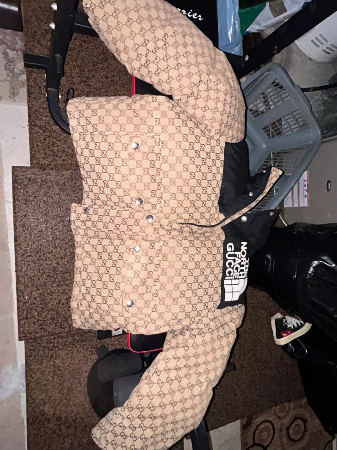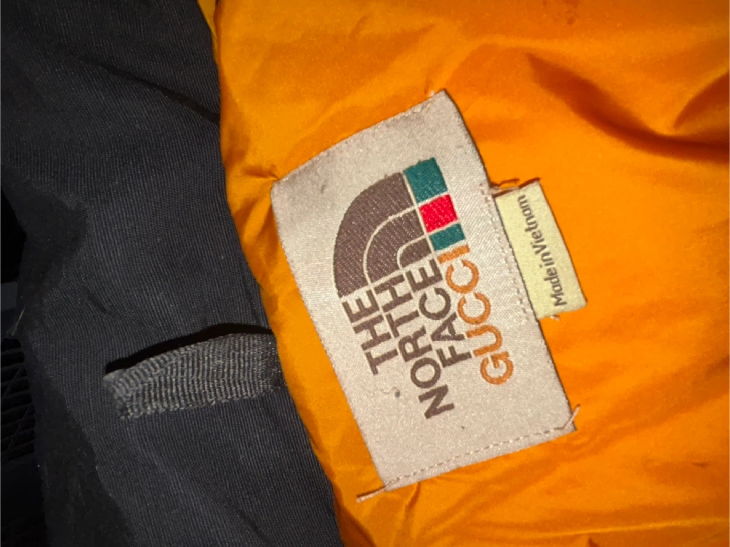 Selling a Gucci x The North Face puffer jacket! It's a size M and features a unique Gucci print. The inside lining is a vibrant orange. Perfect for staying warm and stylish this winter!