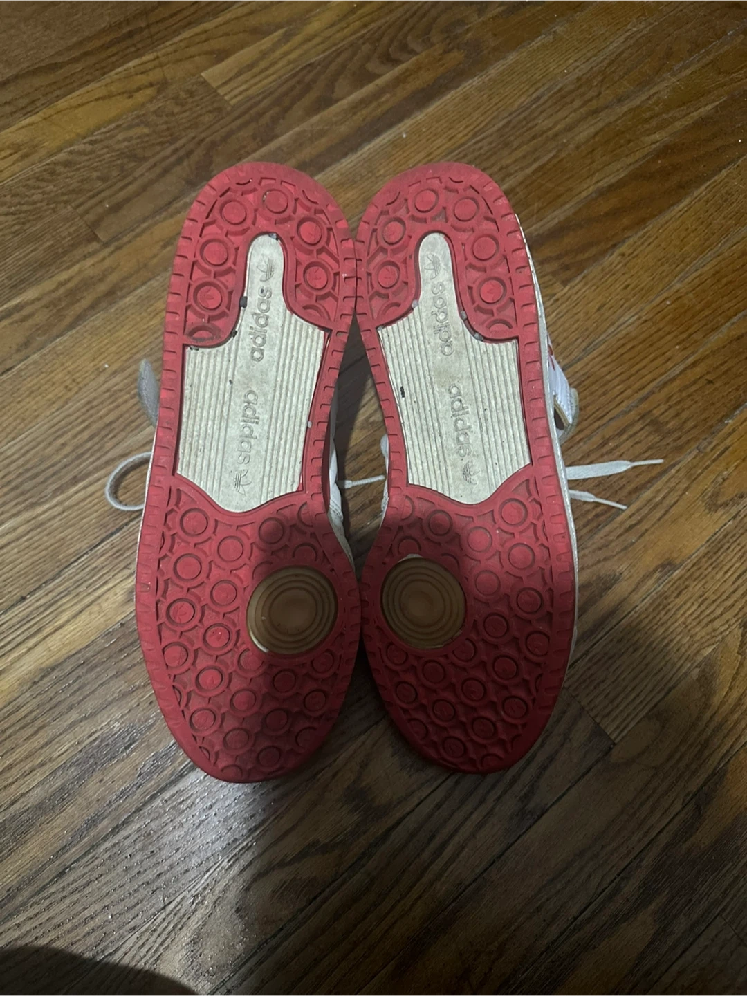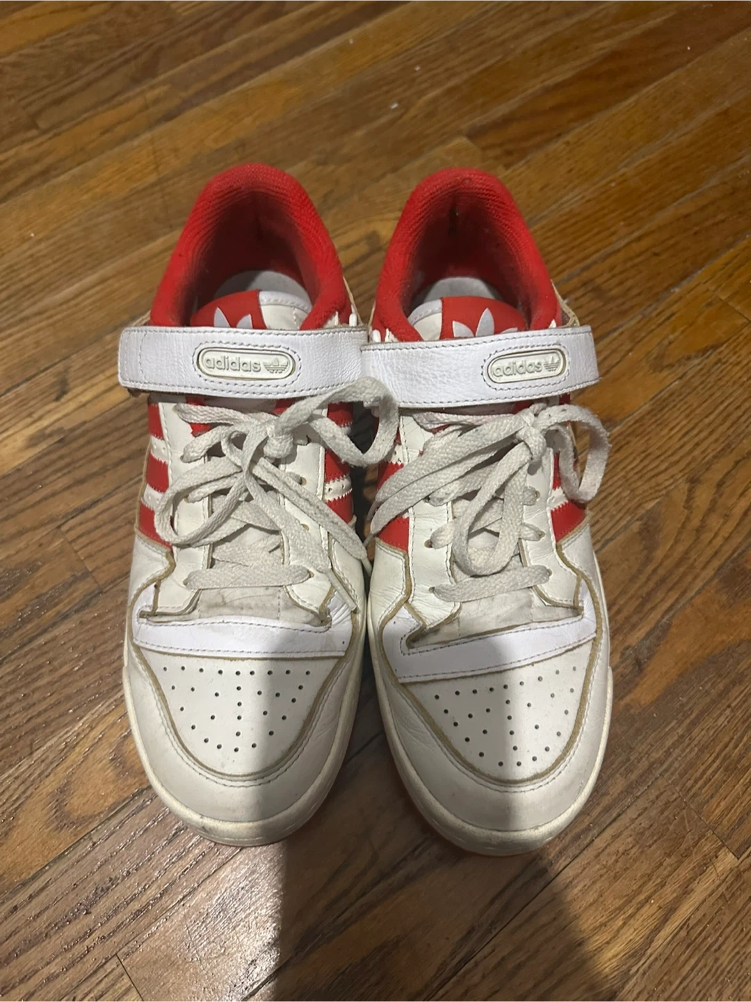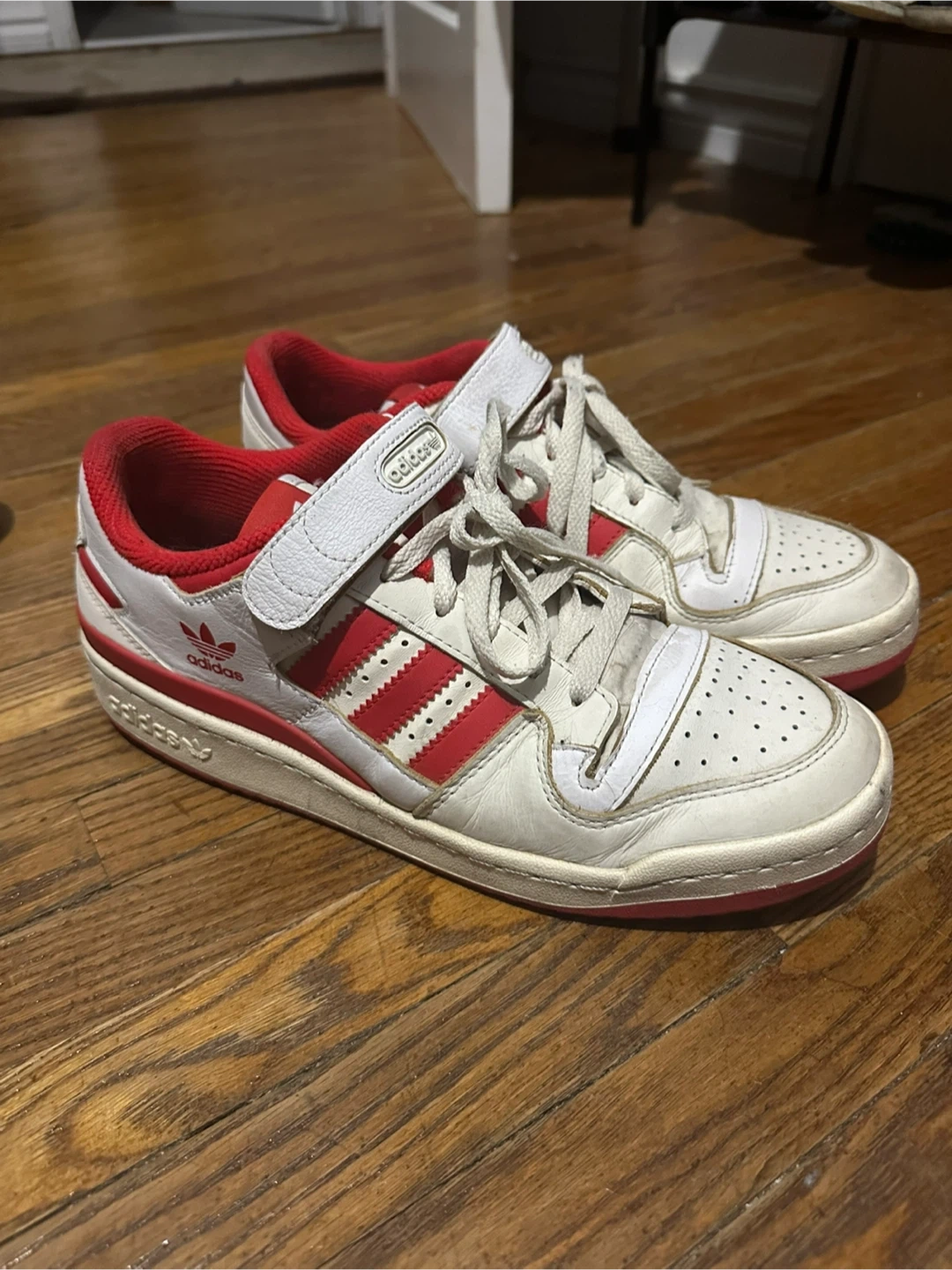Selling a pair of Adidas Forum Low sneakers in size 10. They're white with red stripes and accents. These shoes have a classic look and are still in good condition for casual wear! No rips or tears in the upper leather, soles show some wear and upper shows some creasing but otherwise in good condition with lots of life left in them.