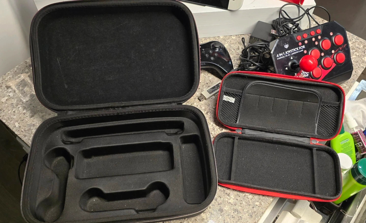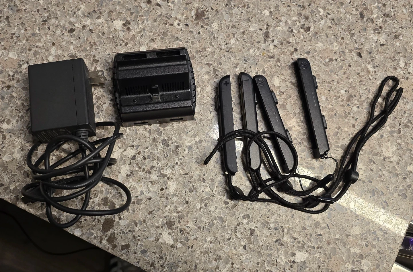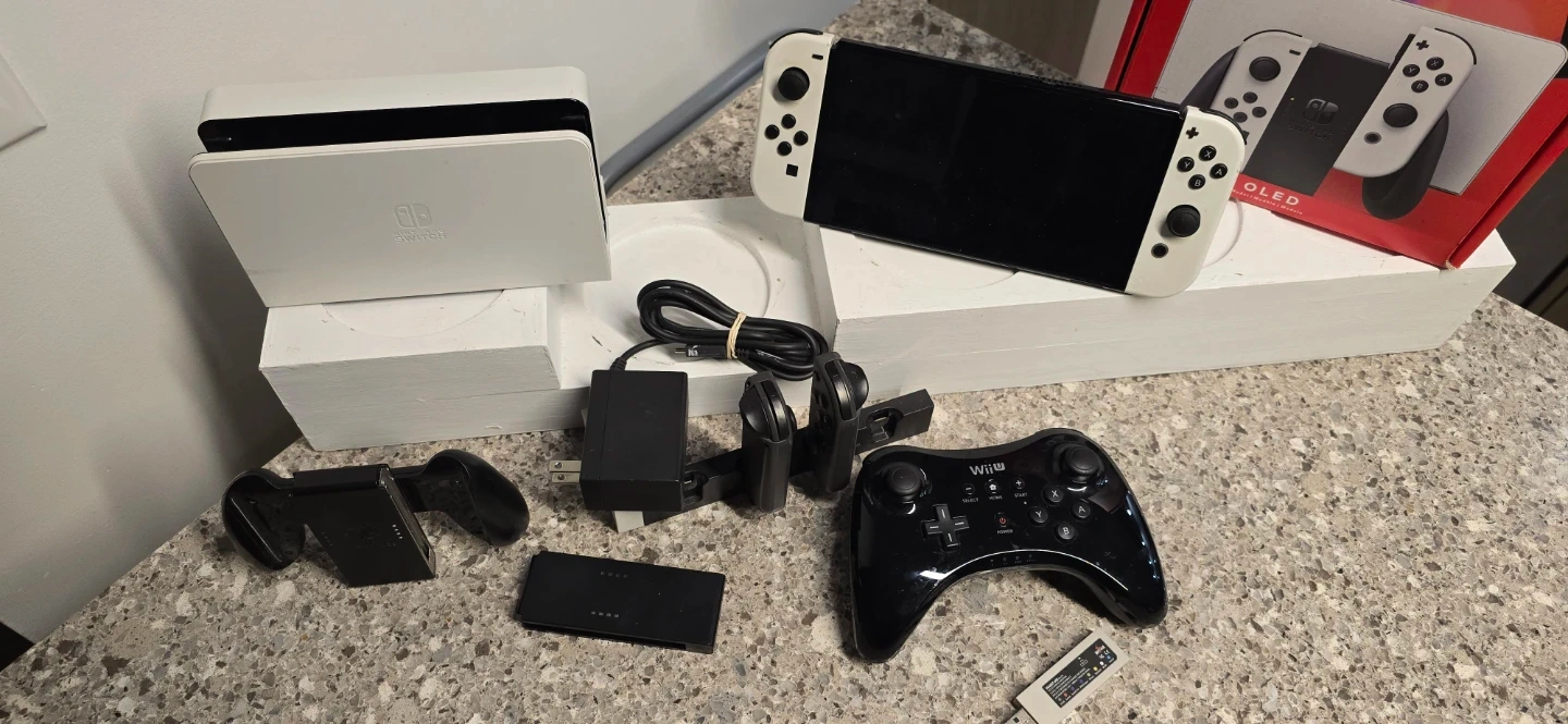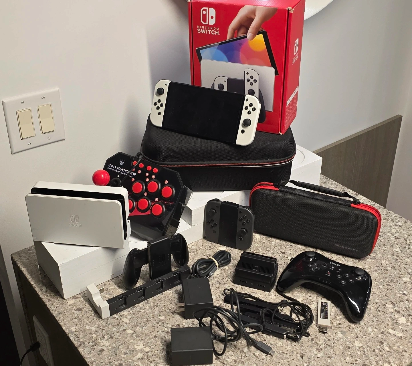 Selling a Nintendo Switch OLED in white, complete with all original accessories and box! Also included are extra joycons, a Wii U controller, a charging dock, and a carrying case for on-the-go gaming