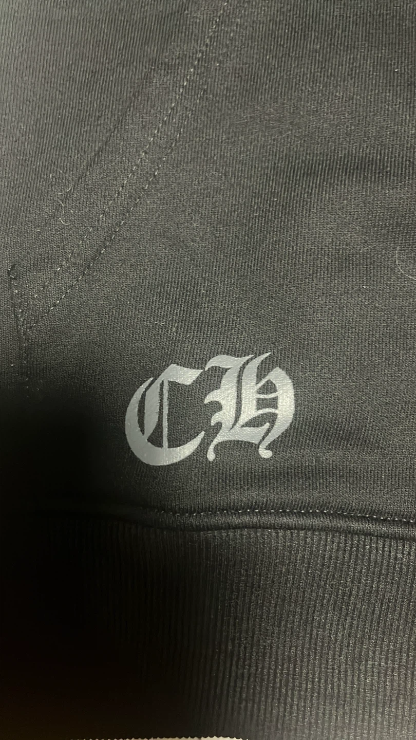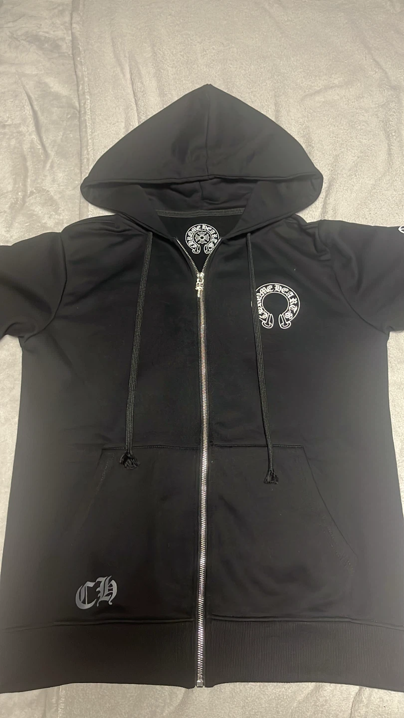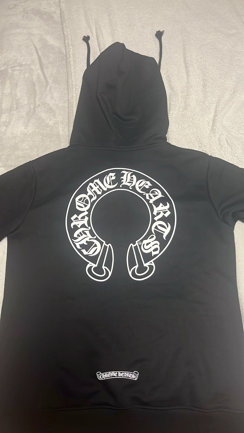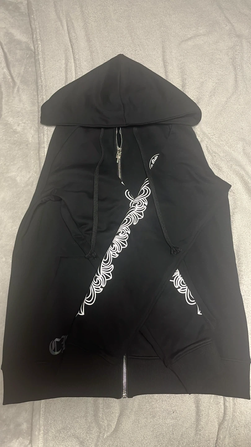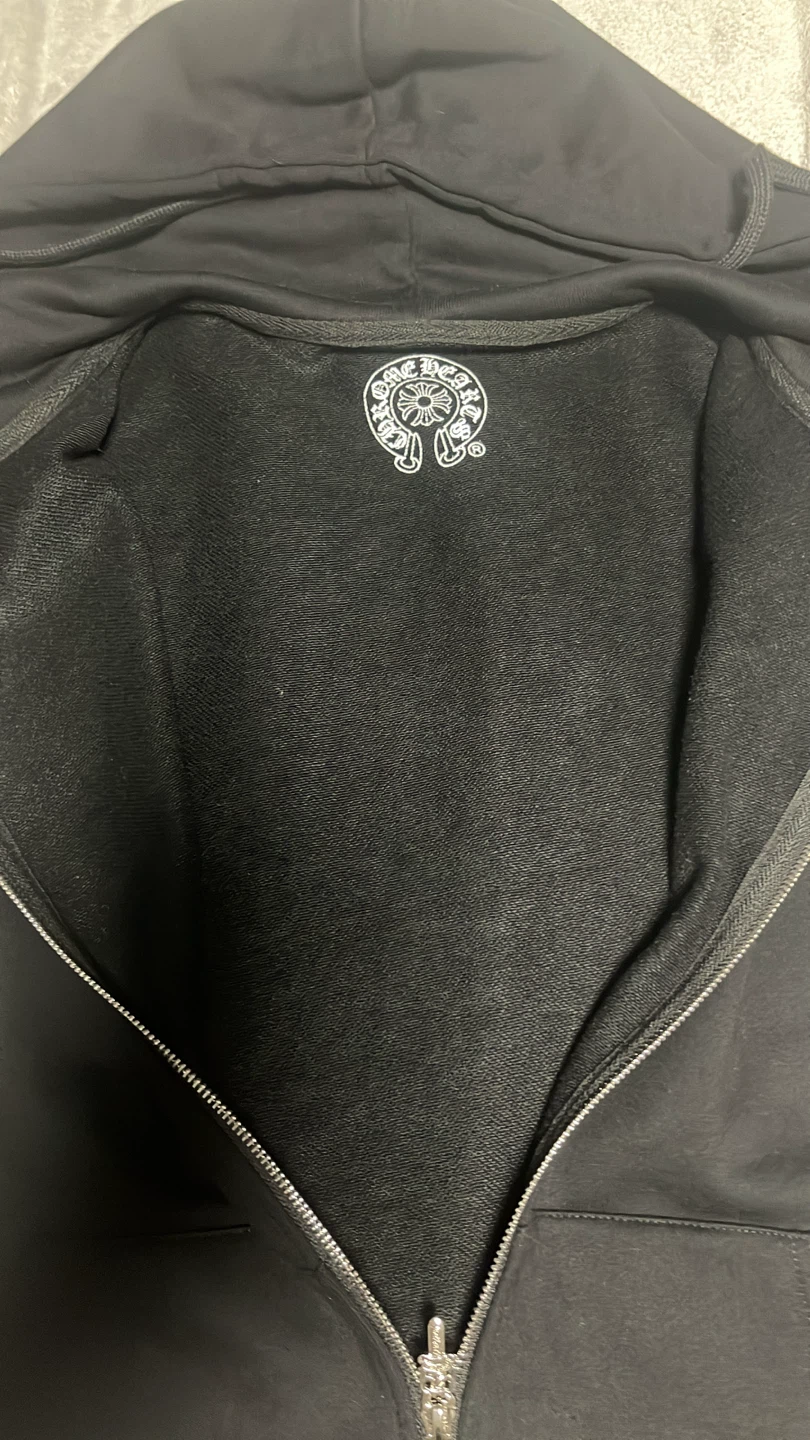 Selling a Chrome Hearts black zip-up hoodie. It features the iconic Chrome Hearts logo and design on the front, back, and sleeves. Great for adding a touch of style to your wardrobe!