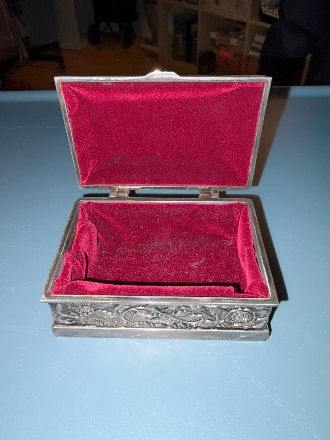 Selling a vintage silver jewelry box with a beautiful floral design. The inside is lined with a vibrant red velvet. It's perfect for storing your precious jewelry or small keepsakes!