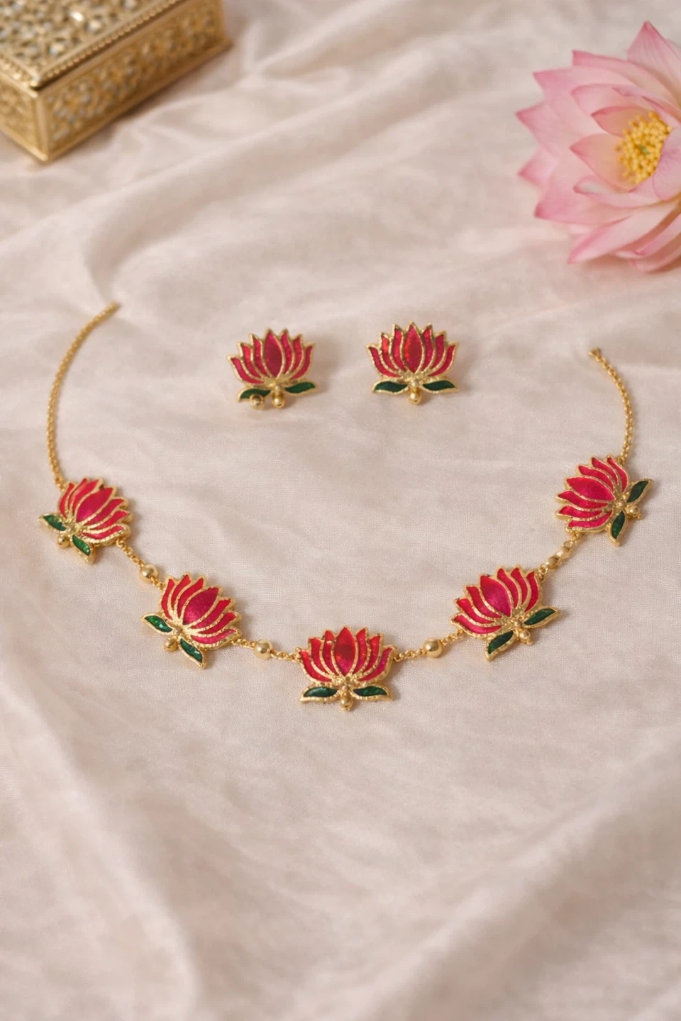 Beautiful necklace and earring set with a lotus design! The set features a delicate gold chain necklace adorned with vibrant red and green lotus flower pendants. Matching stud earrings complete the set. Perfect for adding a touch of elegance to any outfit