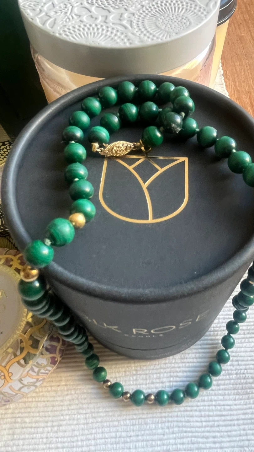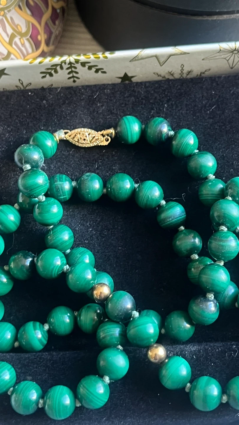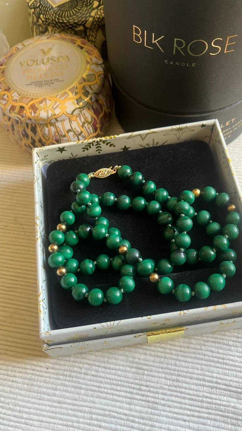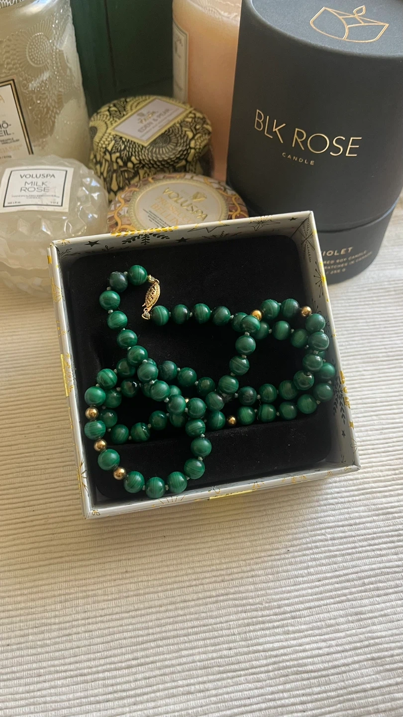 Malachite necklace featuring a 14K gold clasp and gold beads. It is approximately 20 inches in length. A piece like this would make a lovely gift for someone special, even if that someone is you!