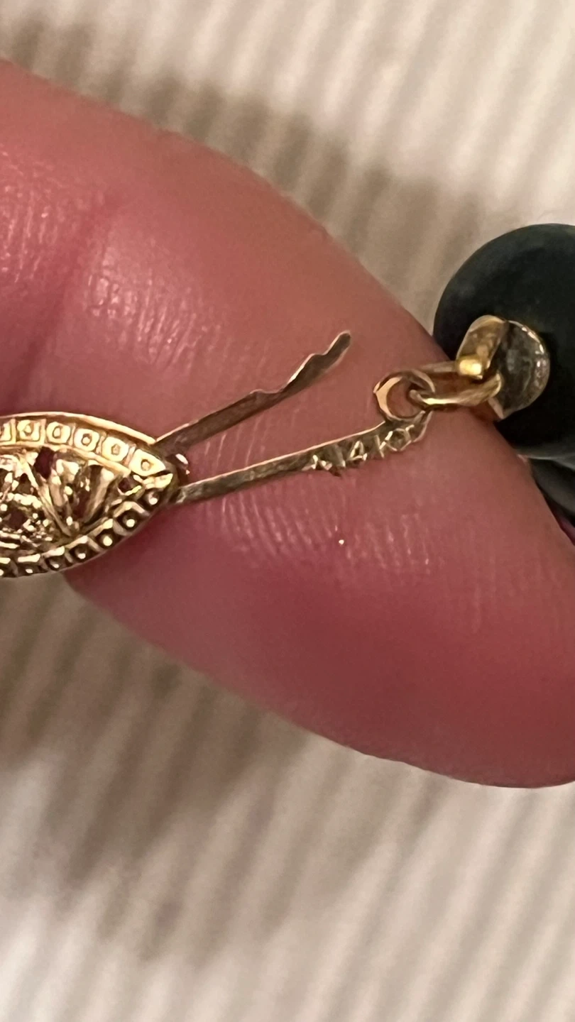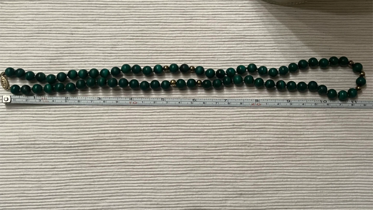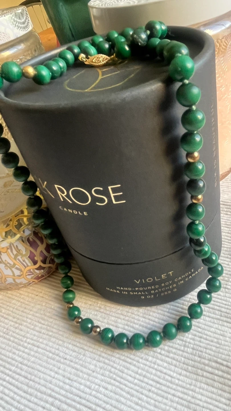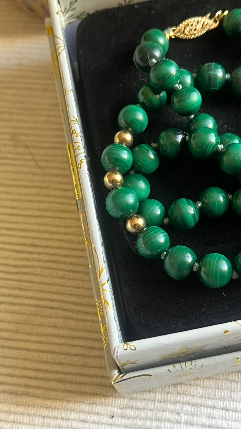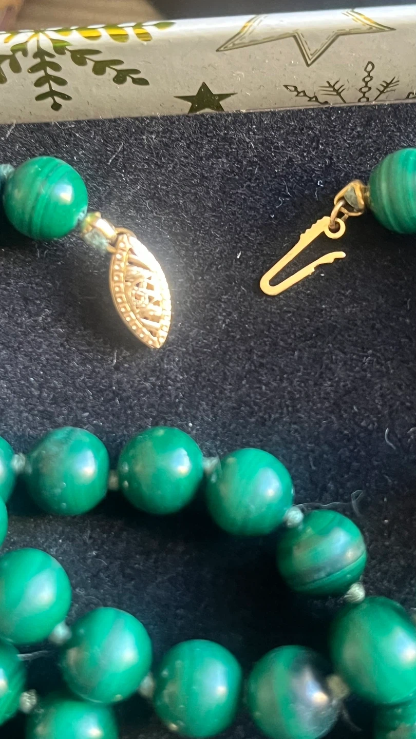 Malachite necklace featuring a 14K gold clasp and gold beads. It is approximately 20 inches in length. A piece like this would make a lovely gift for someone special, even if that someone is you!