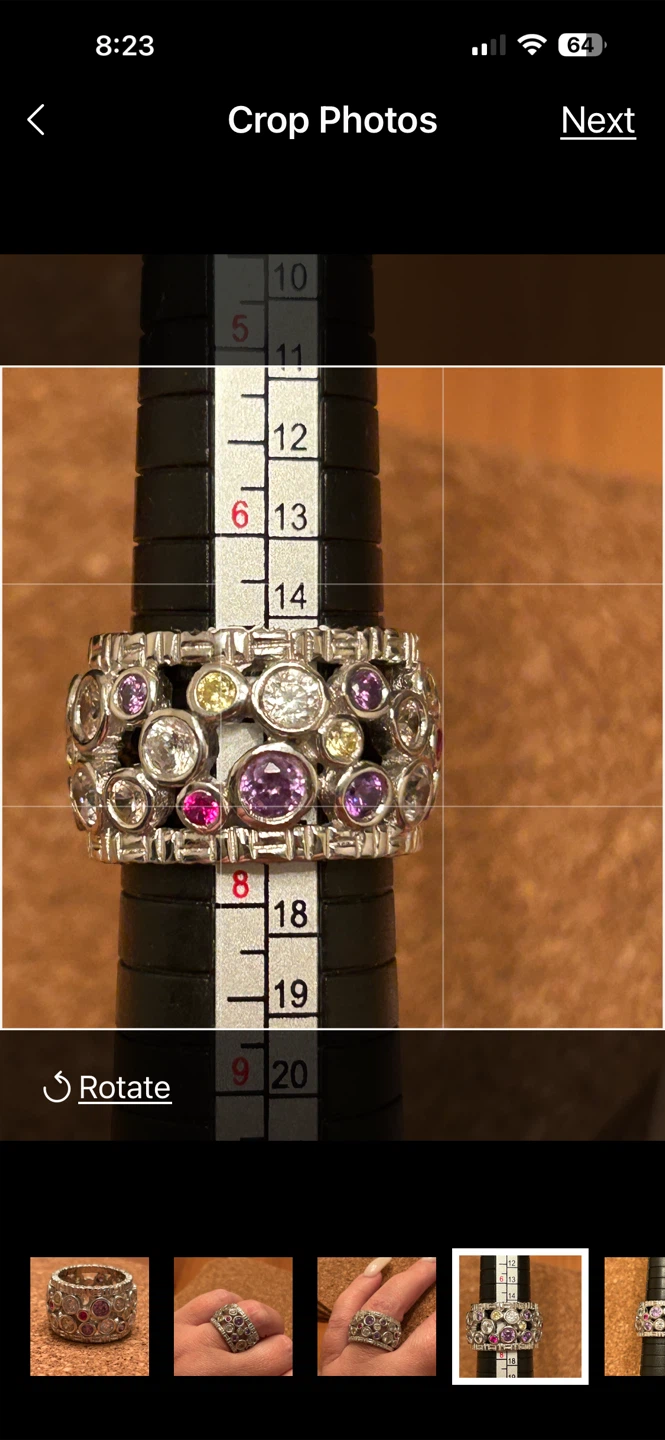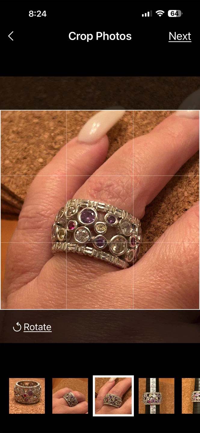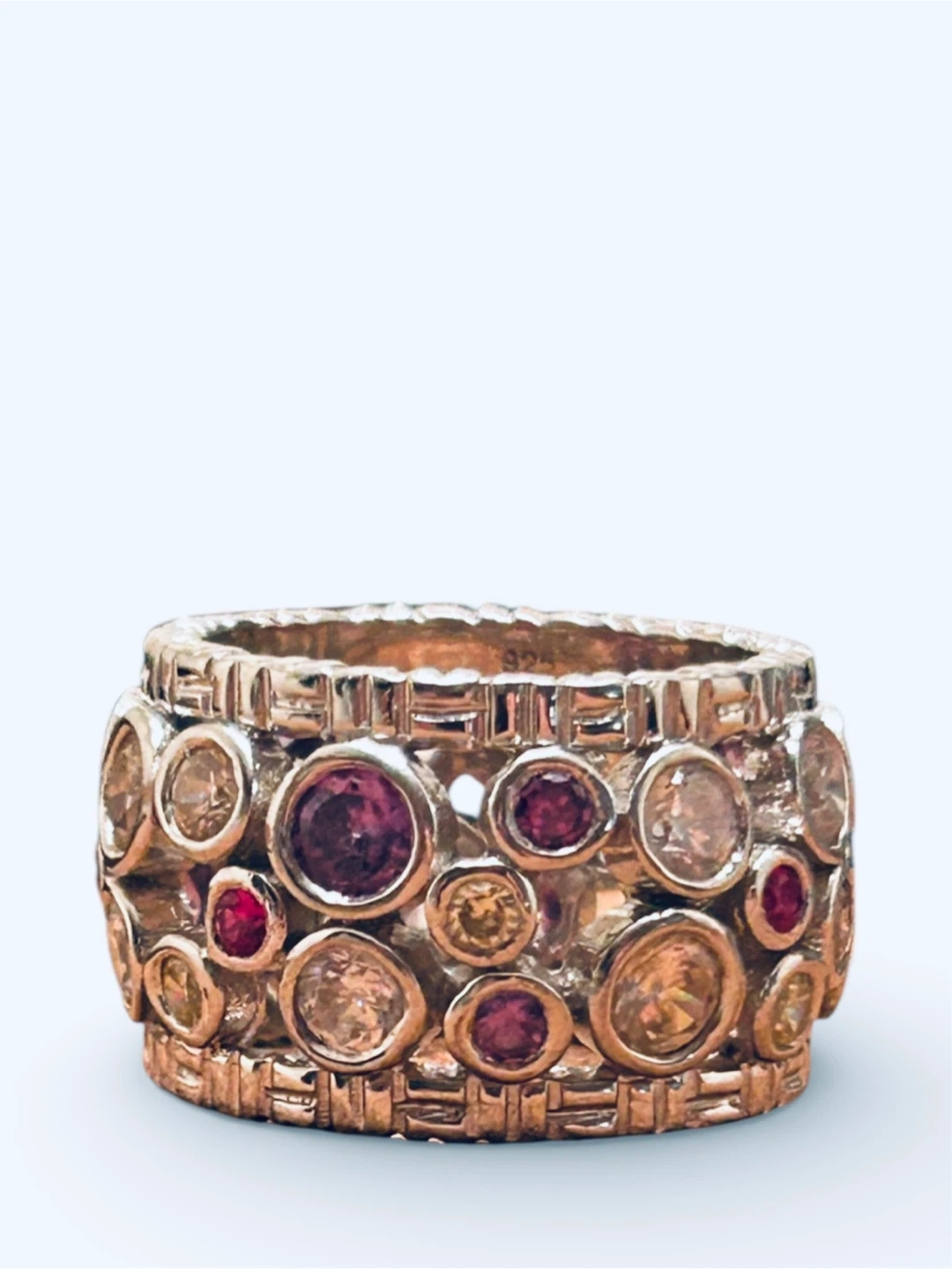 Has a heavier solid weight to it! Super well made! Sterling silver and rhodium plated (looks more like platinum and is great as it doesn’t need to be cleaned due to tarnishing, the way sterling silver that isn’t rhodium plated needs to be cleaned!). Multi coloured gemstones, (pink, red, purple, clear, yellow), but no clue of they’re real or man-made. Fits between size 7-8 on mandrel, so I’d say this is a 7.5 size.