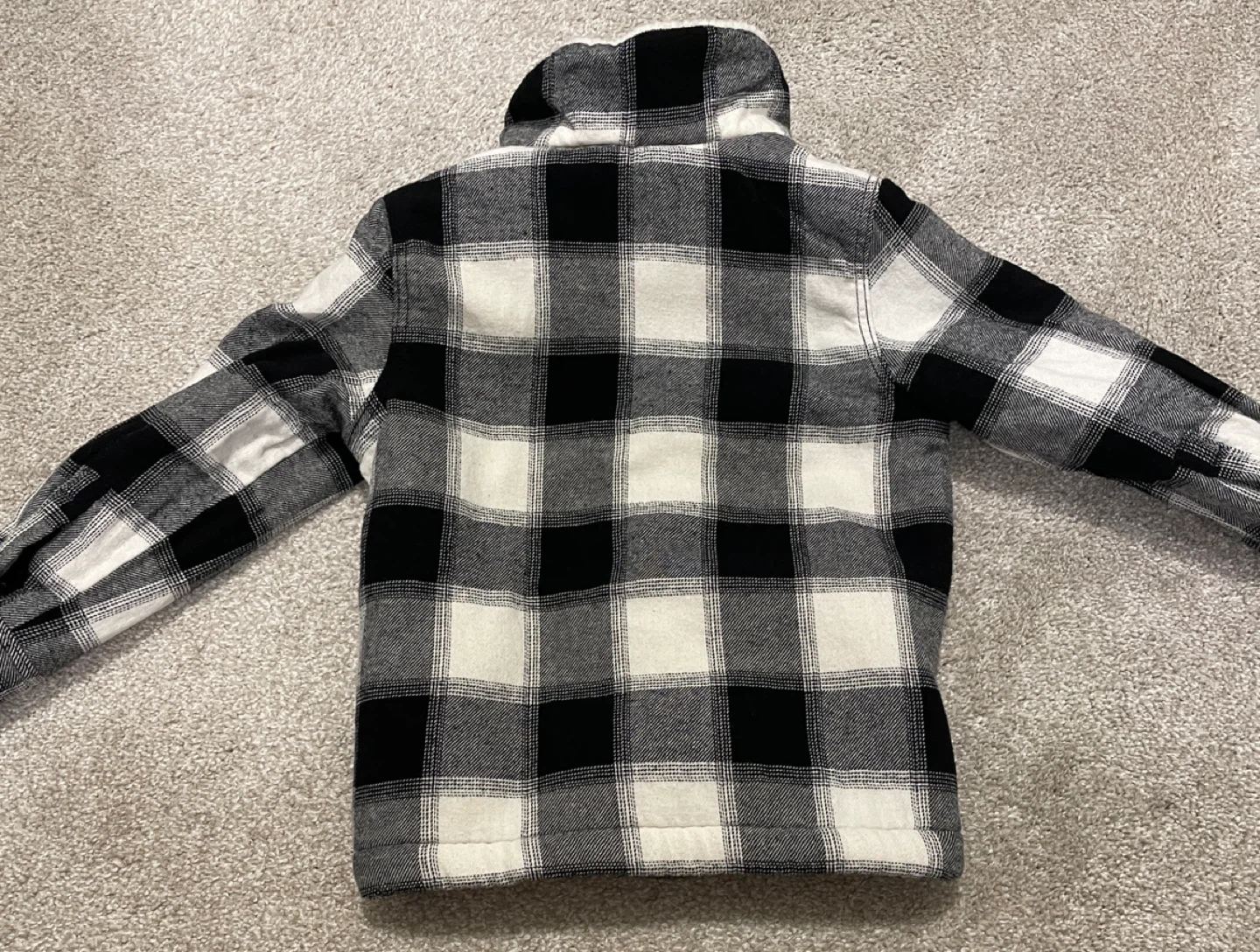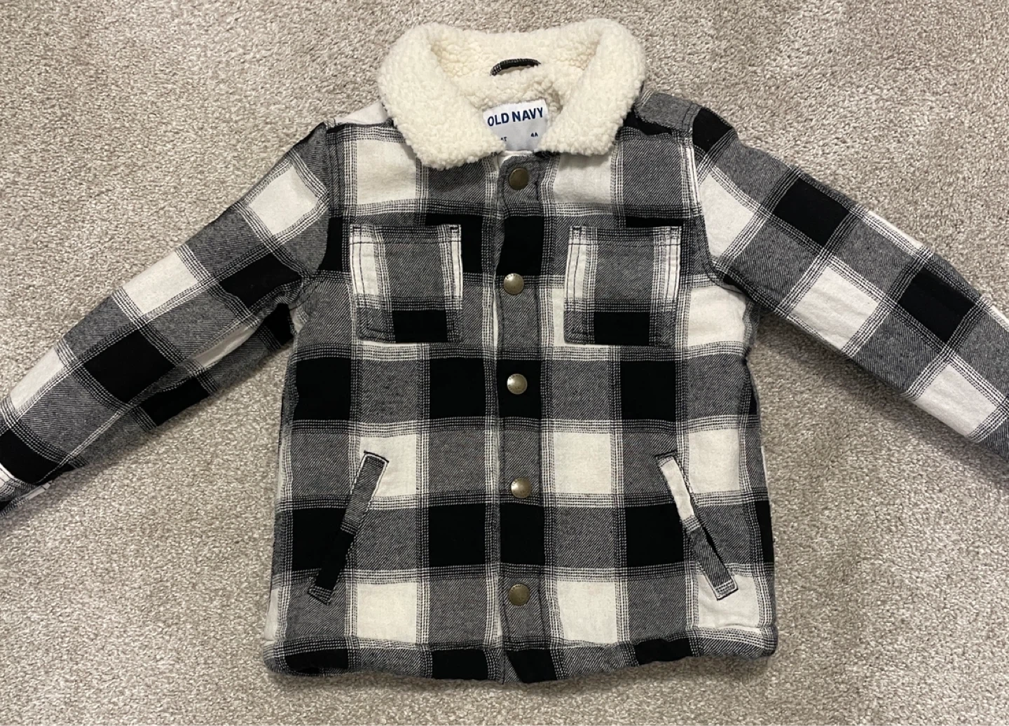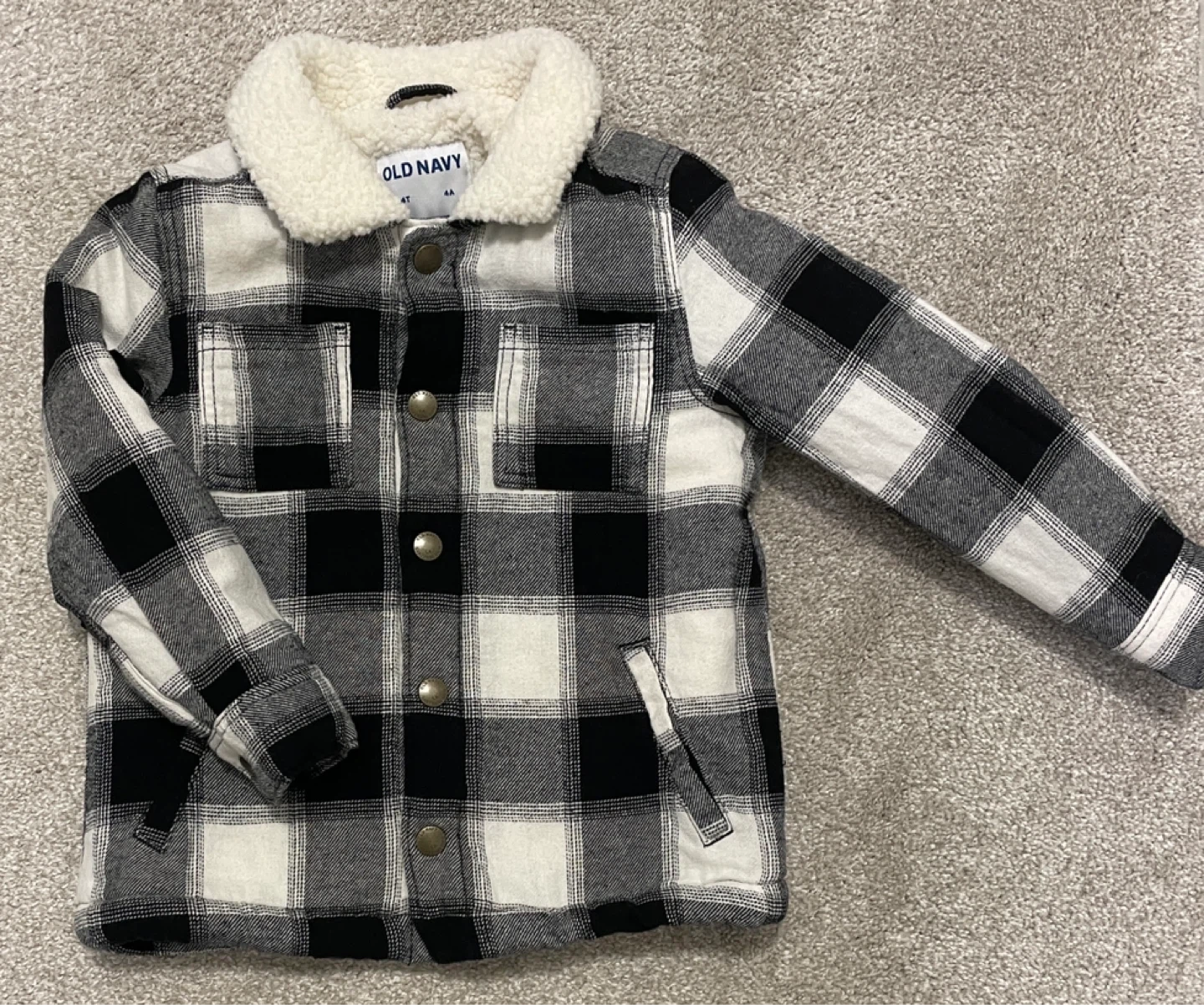 Keep your little one cozy with this Old Navy flannel jacket! It features a black and white plaid pattern and a super soft sherpa lining. It's in great condition and perfect for layering during cooler weather.