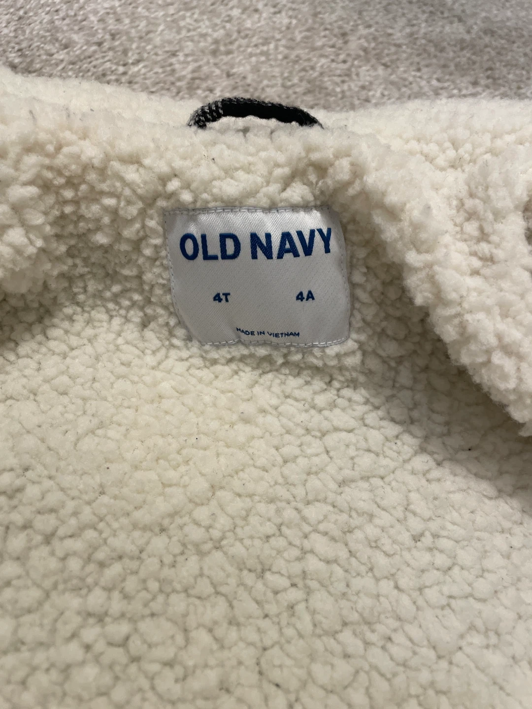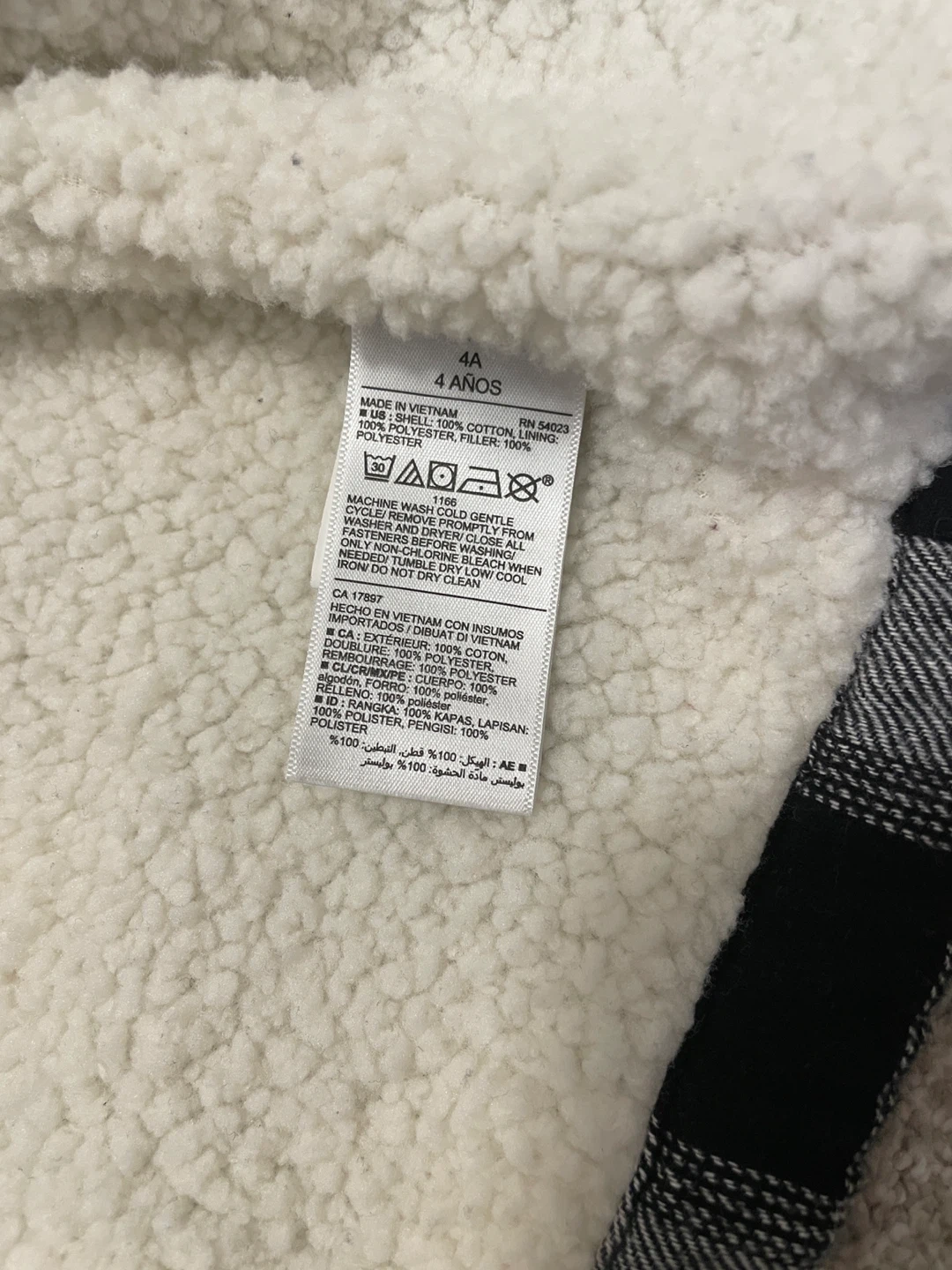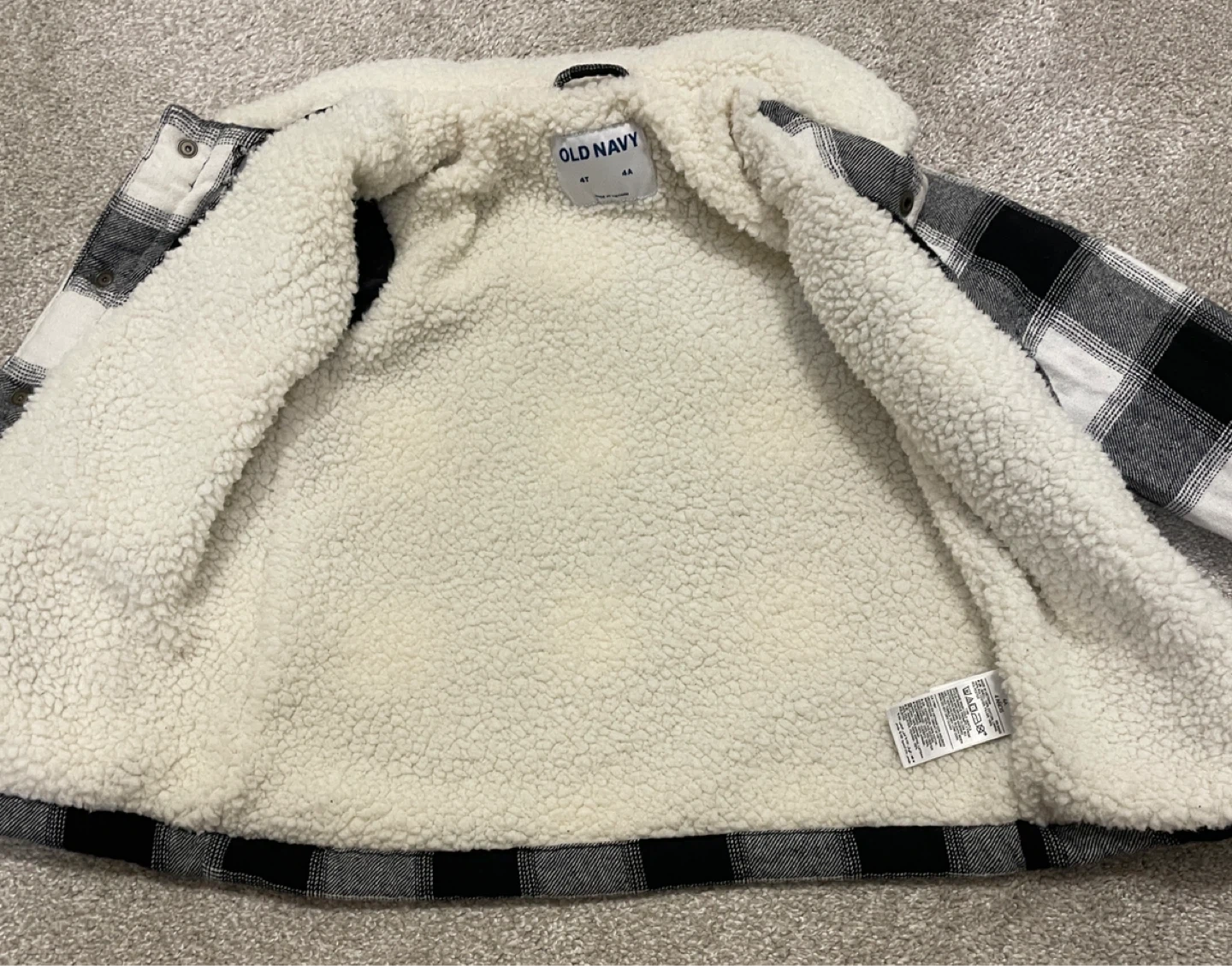Keep your little one cozy with this Old Navy flannel jacket! It features a black and white plaid pattern and a super soft sherpa lining. It's in great condition and perfect for layering during cooler weather.