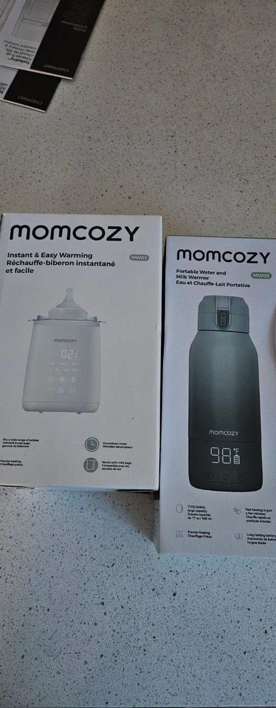 Momcozy baby bottle warmerr (MW01) and a portable water and milk warmer (MW05). Both are in excellent condition and ready to use! The bottle warmer is an instant and easy warming device, while the portable warmer can hold 17oz/500ml. Great for parents on the go!