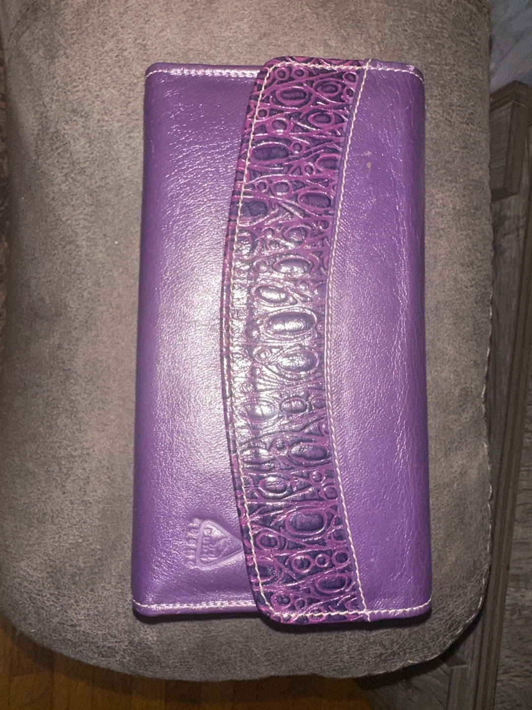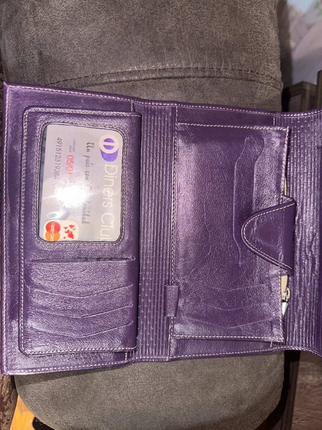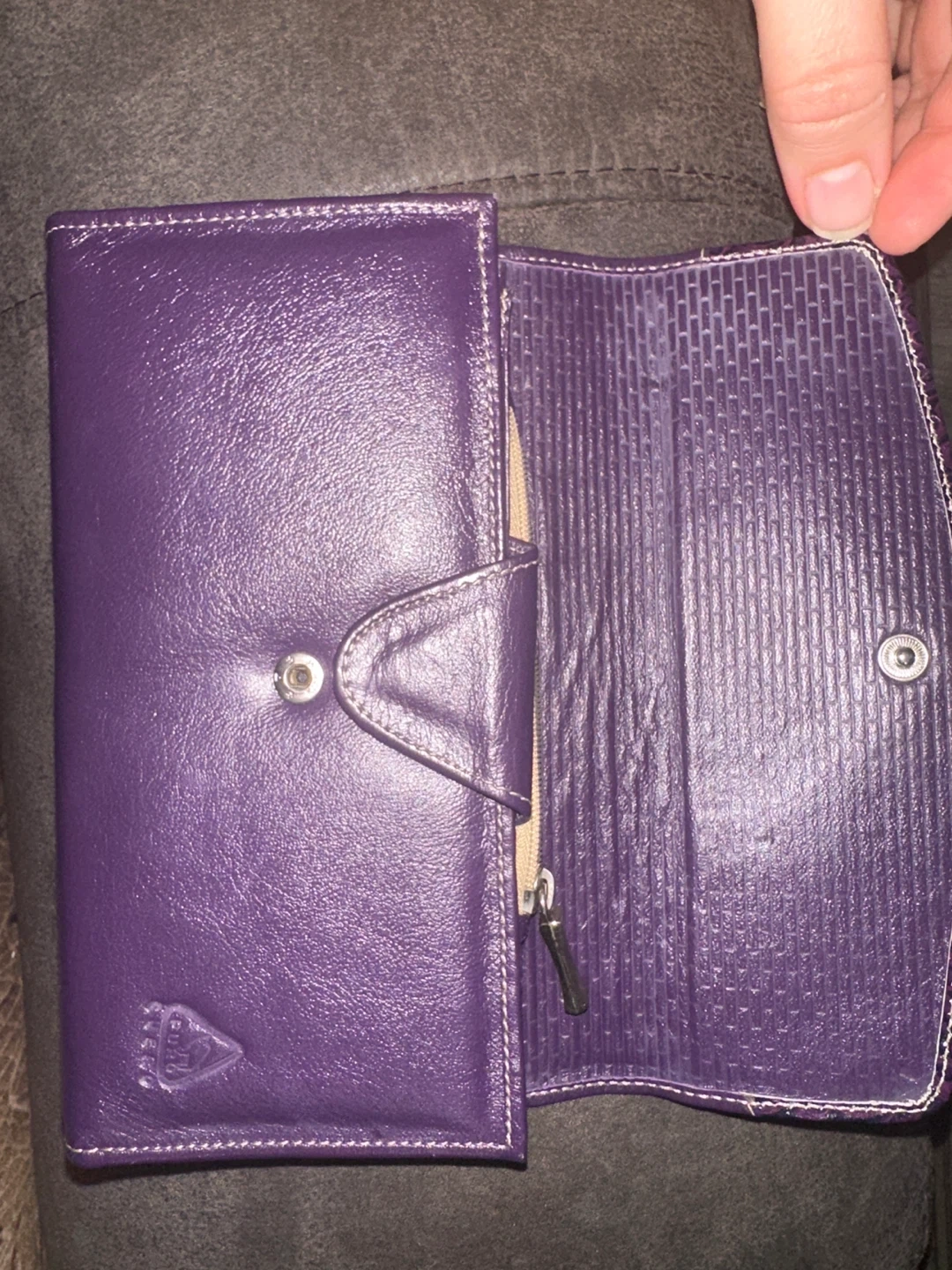 This is a Garo wallet in purple leather. It has a unique design and plenty of space for your cards and cash. It's in good condition and ready for a new owner!
