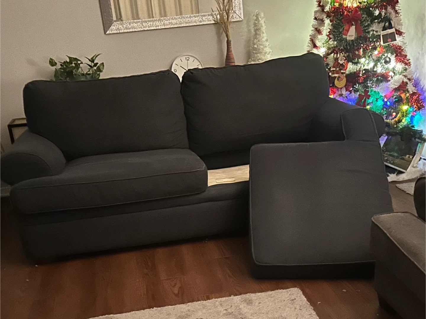 Selling a comfy navy sofa that's perfect for relaxing! It comes with a matching ottoman so you can kick up your feet. There are some signs of use, but it's still in great shape for lounging and movie nights