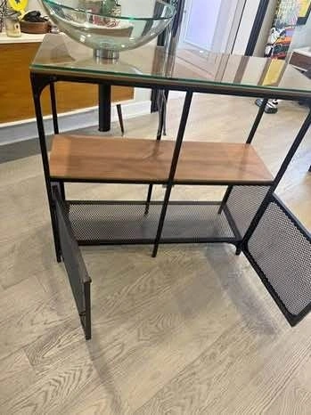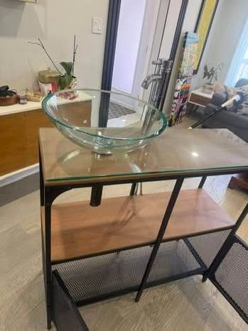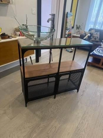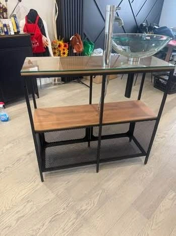 ✨ Metal frame, wood shelving, glass sink