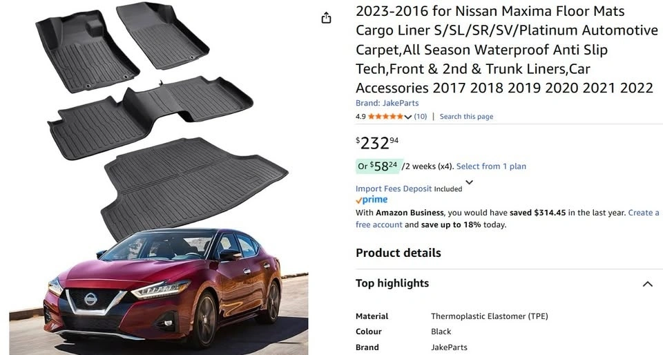 Nissan Maxima Floor Mats + Trunk Liner (2016–2023)