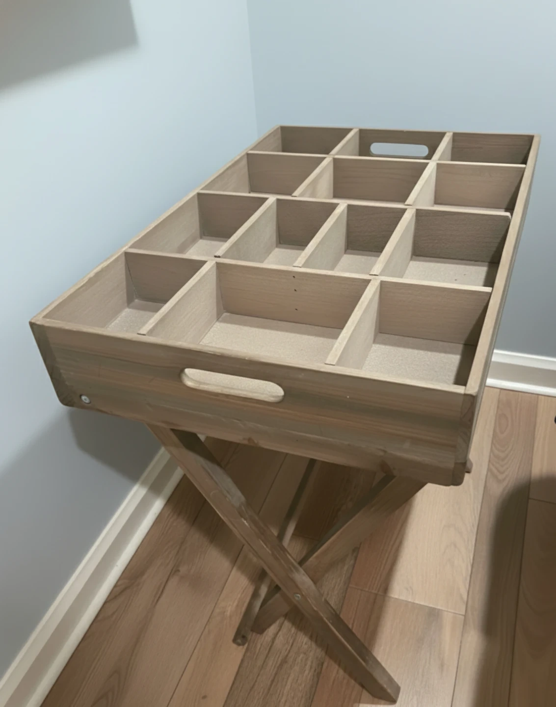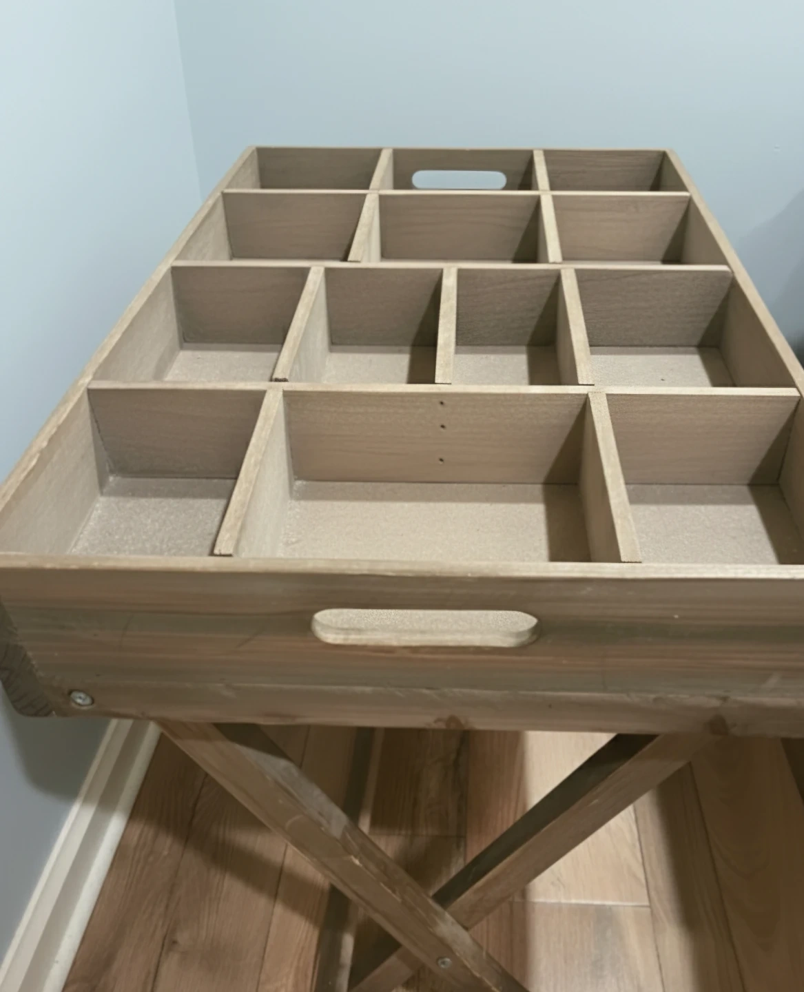 Selling a wooden cubby tray table! It's perfect for organizing small items or displaying collectibles. The table has a rustic, charming look and is in great condition. The foldable legs make it easy to store when not in use