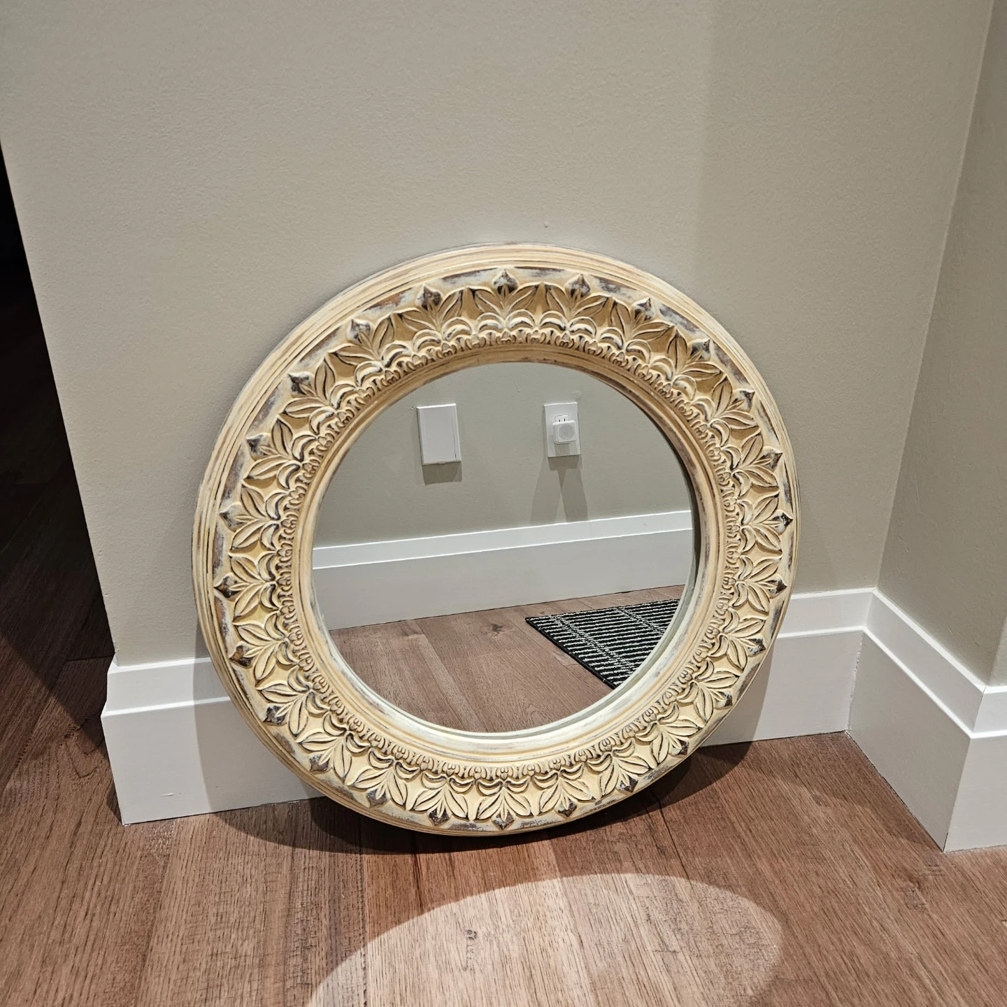Selling a lovely round decorative mirror. It has a beautiful, ornate frame with a vintage-inspired design. It would look great in any room!