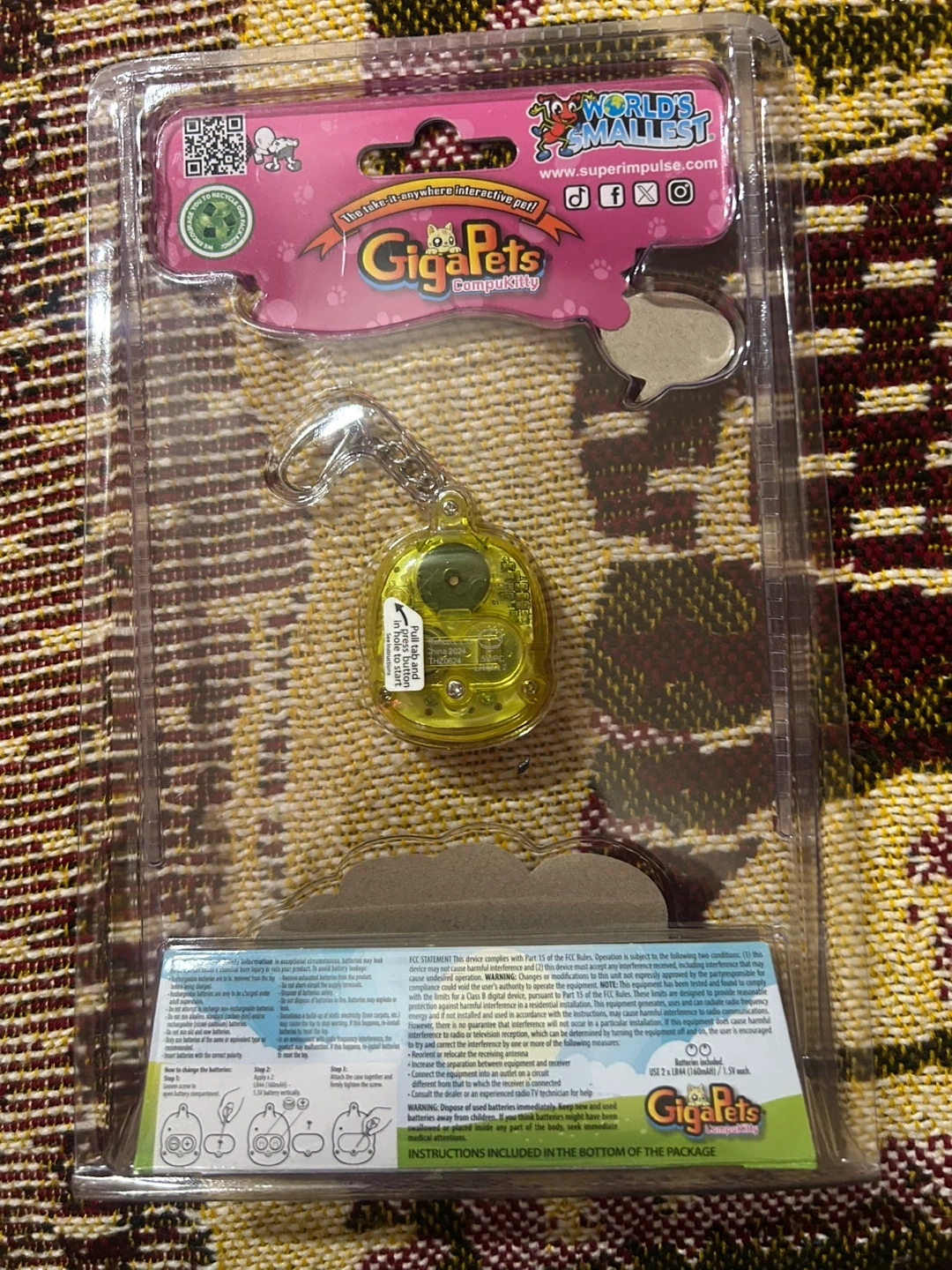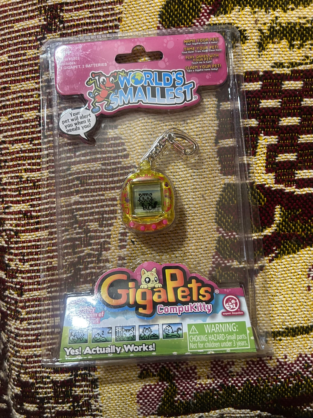 I'm selling a brand new, in-package World's Smallest Giga Pets Compukitty! It actually works! This tiny virtual pet is ready to alert you when it needs you. It includes 2 batteries.