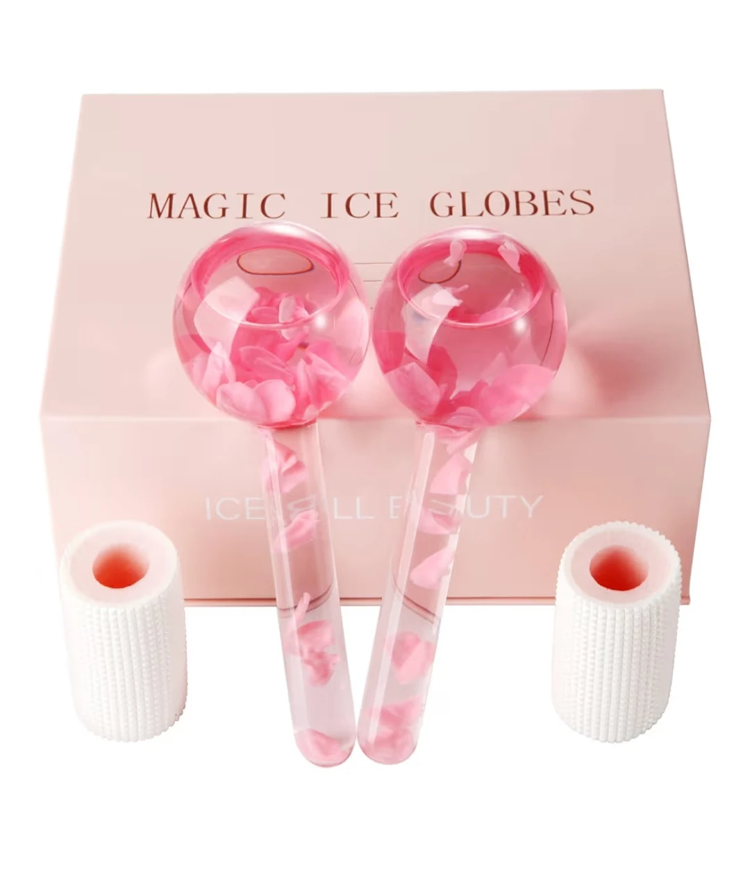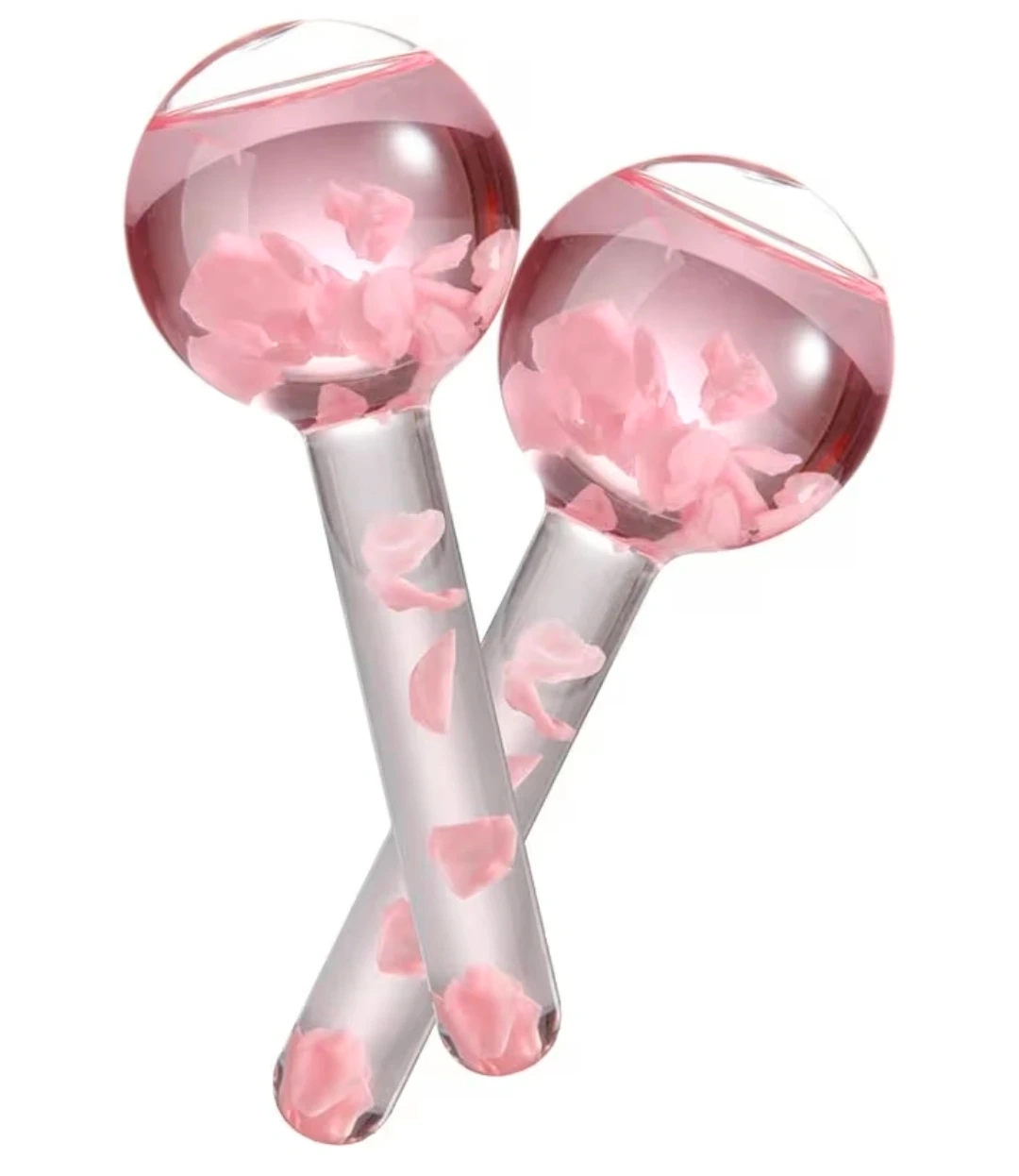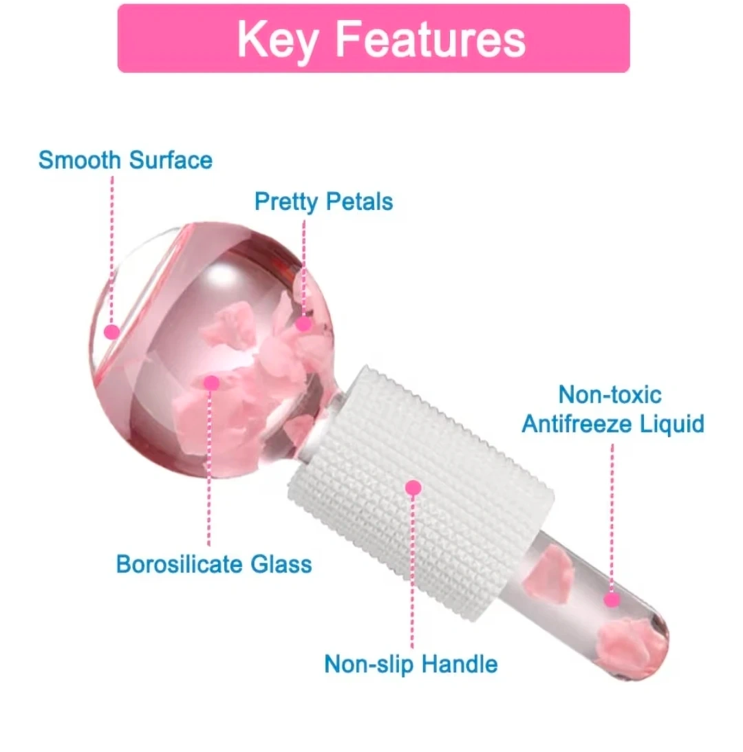 These Magic Ice Globes are perfect for reducing puffiness, redness, and dark circles. They help tighten skin, reduce fine lines, enhance circulation, and shrink pores. The globes have a smooth surface and contain pretty petals in a non-toxic antifreezing liquid. They feature a non-slip handle and are made of borosilicate glass