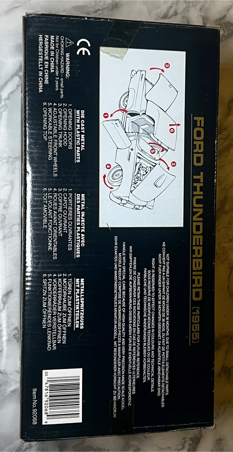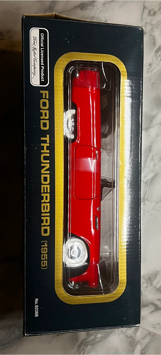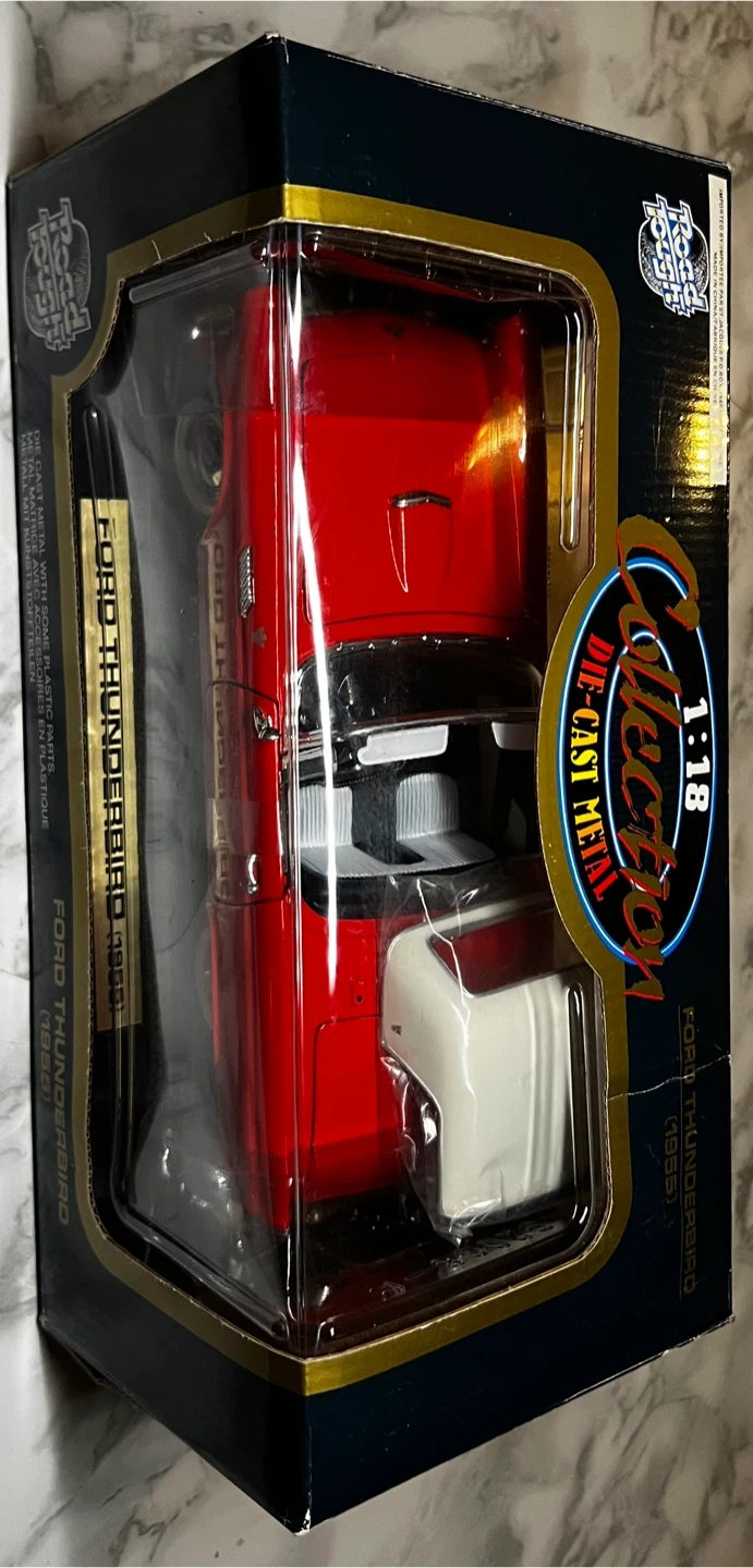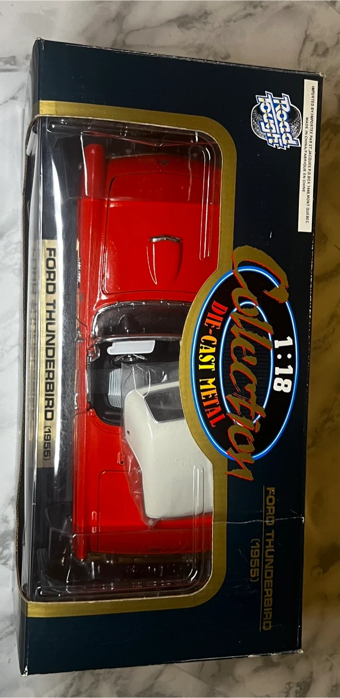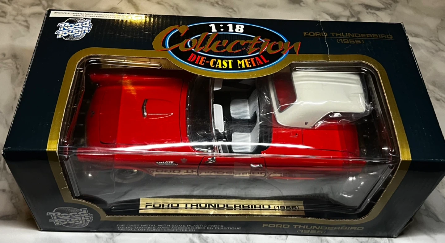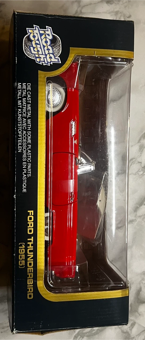 Selling a Road Tough 1:18 scale die-cast metal model car of a 1955 Ford Thunderbird. It's in its original box and looks to be in great shape! The box indicates it has: