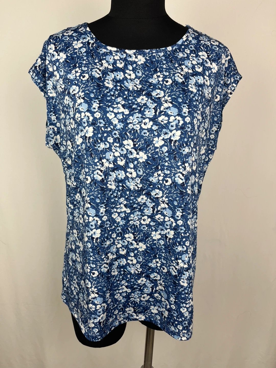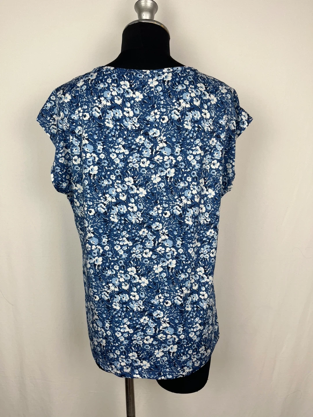 This is a lovely floral print top in shades of blue and white. It's perfect for a casual day out or dressing up for a special occasion. The material is lightweight and comfortable, making it ideal for warmer weather. It's in great condition and ready for a new home!
