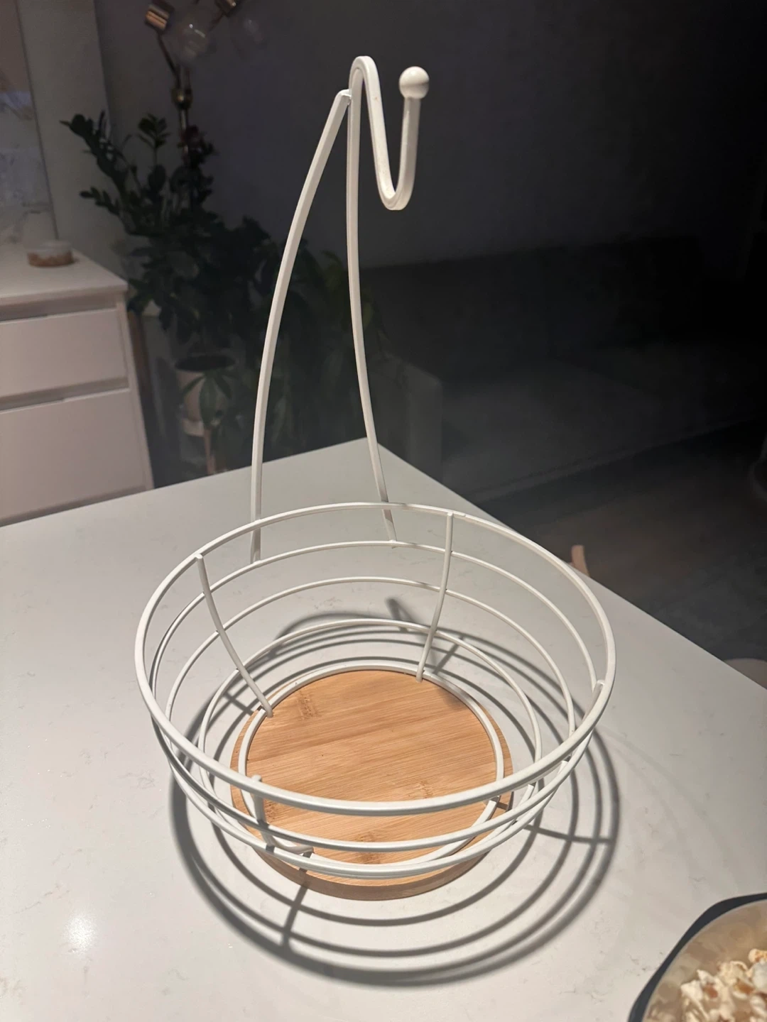 Selling a cute fruit basket! It's white metal with a wooden base. Perfect for keeping your fruit fresh and organized on your counter