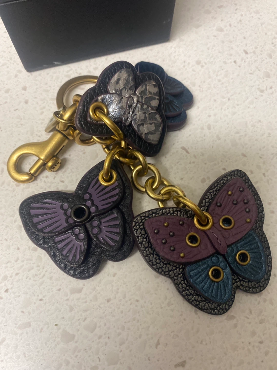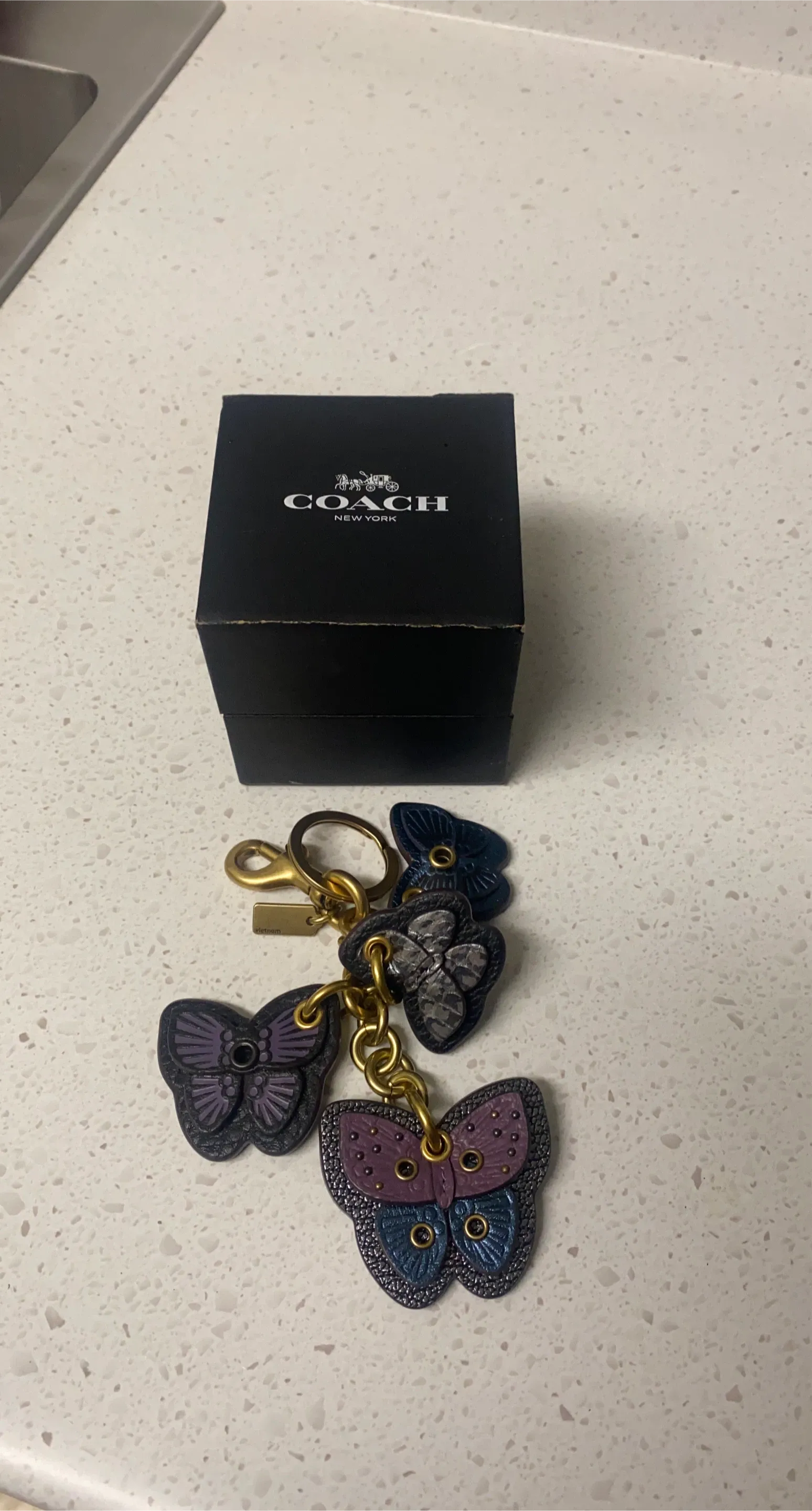 Here's a cute Coach butterfly charm key chain! It features multiple butterflies in different colours and textures. The box is included!