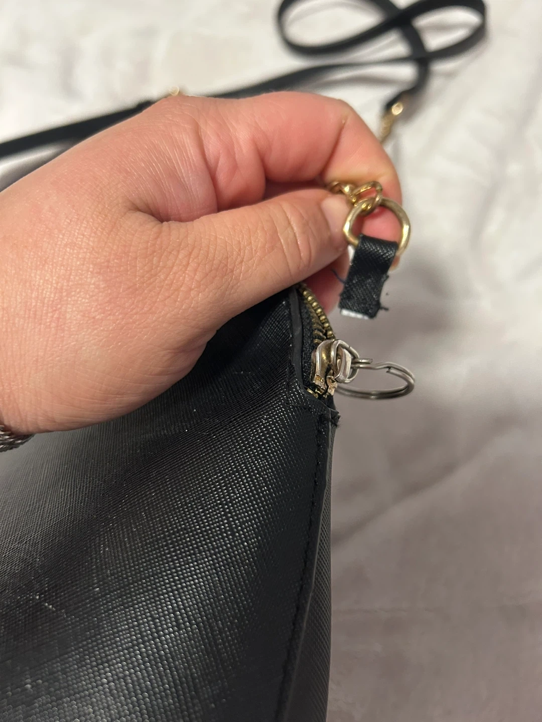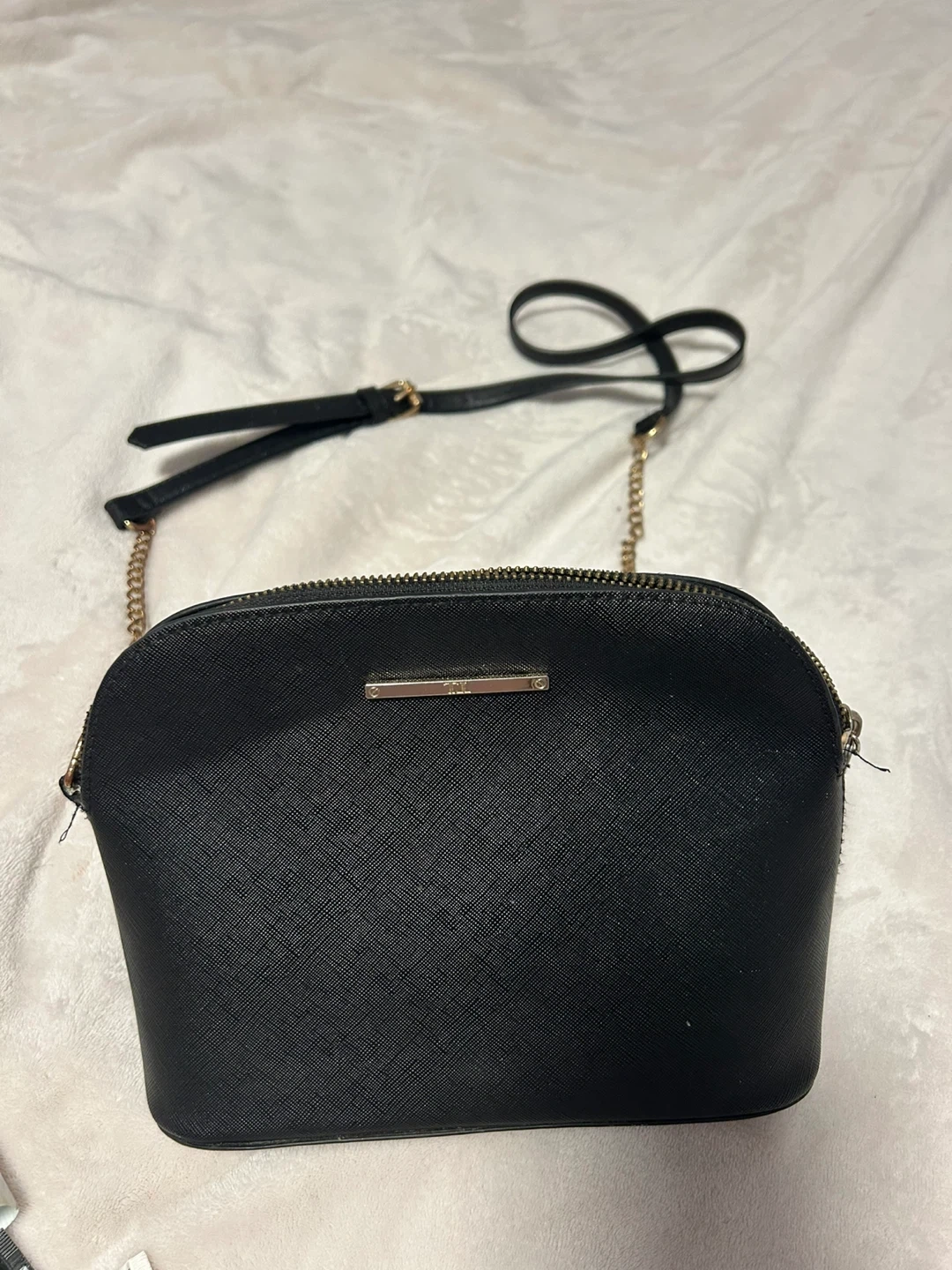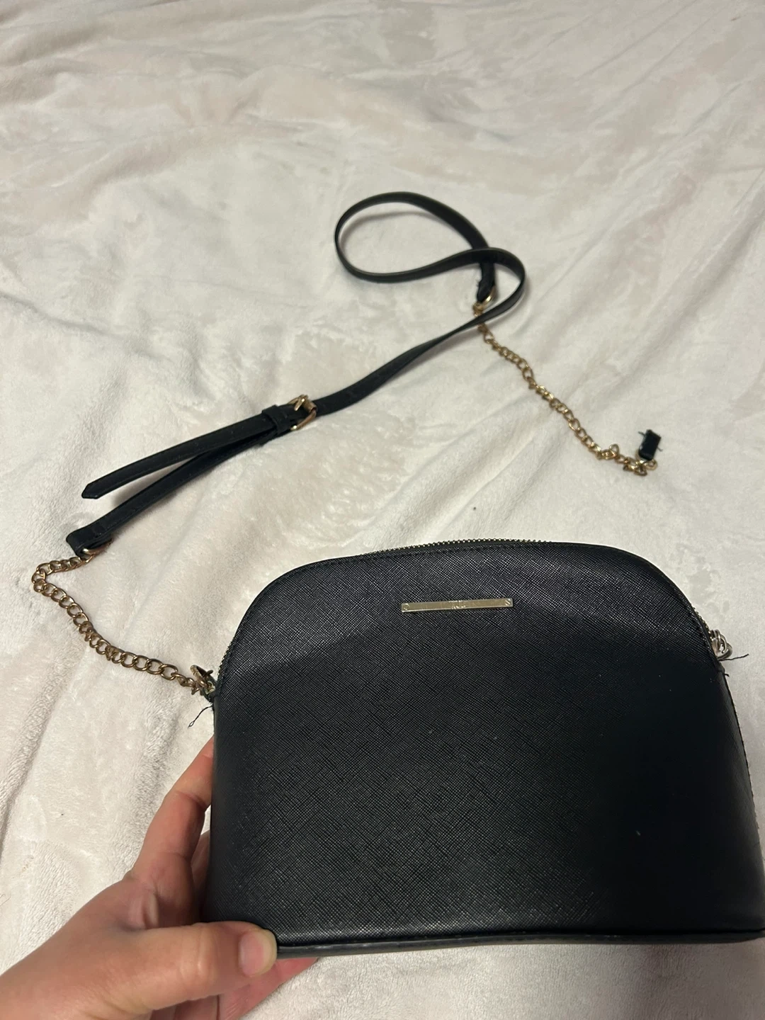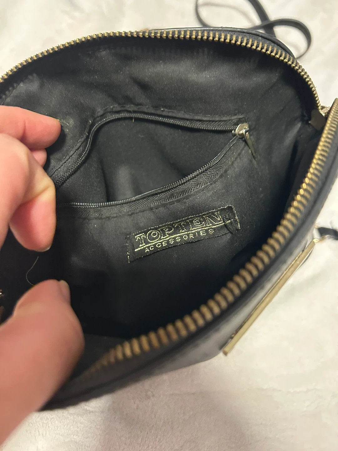 Selling a cute black crossbody bag from Top Ten Accessories! It features a gold chain strap and a small zippered pocket inside. There is some wear and tear on the zipper, as shown in the photos.