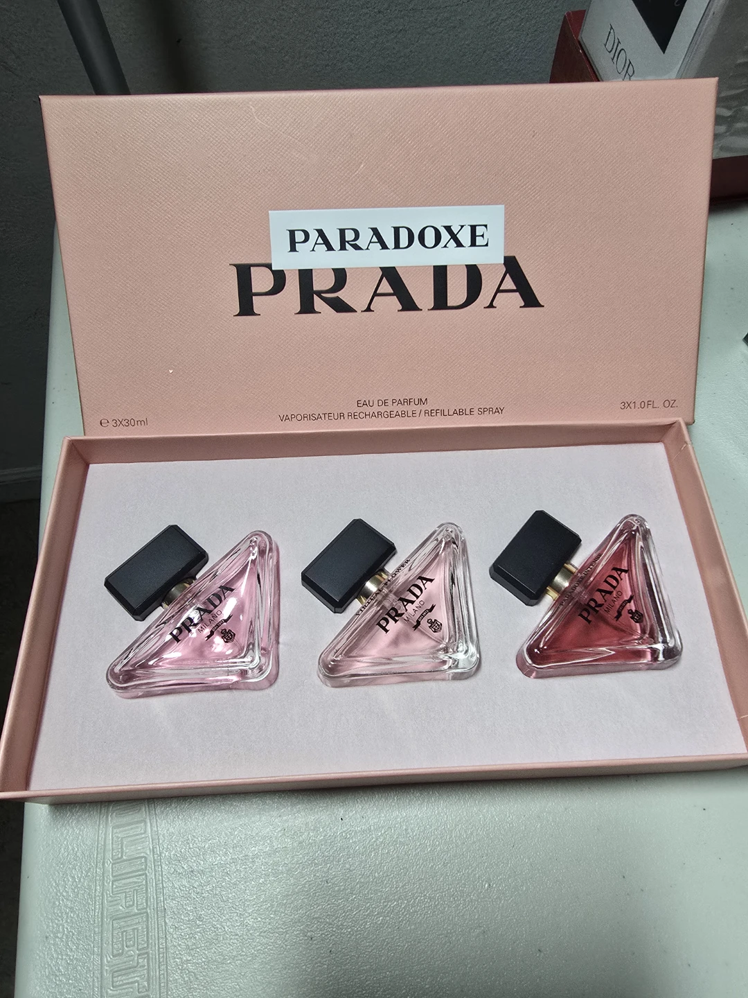 Selling a Prada Paradoxe Eau de Parfum gift set! It includes three 30ml bottles, each with a slightly different shade. The set comes in its original box, perfect for gifting or treating yourself