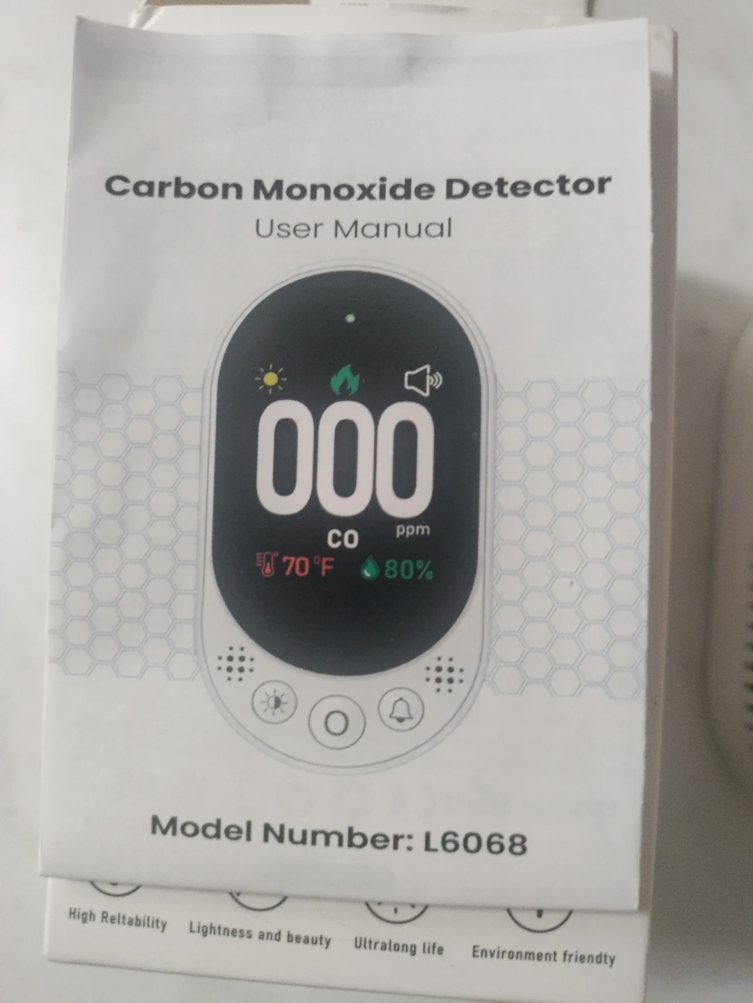 Selling a Carbon Monoxide Detector, Model L6068. It comes with the user manual. It is lightweight and easy to use