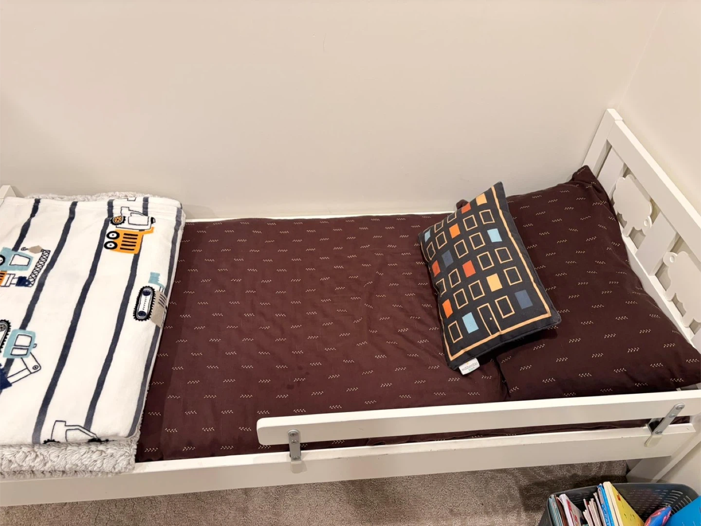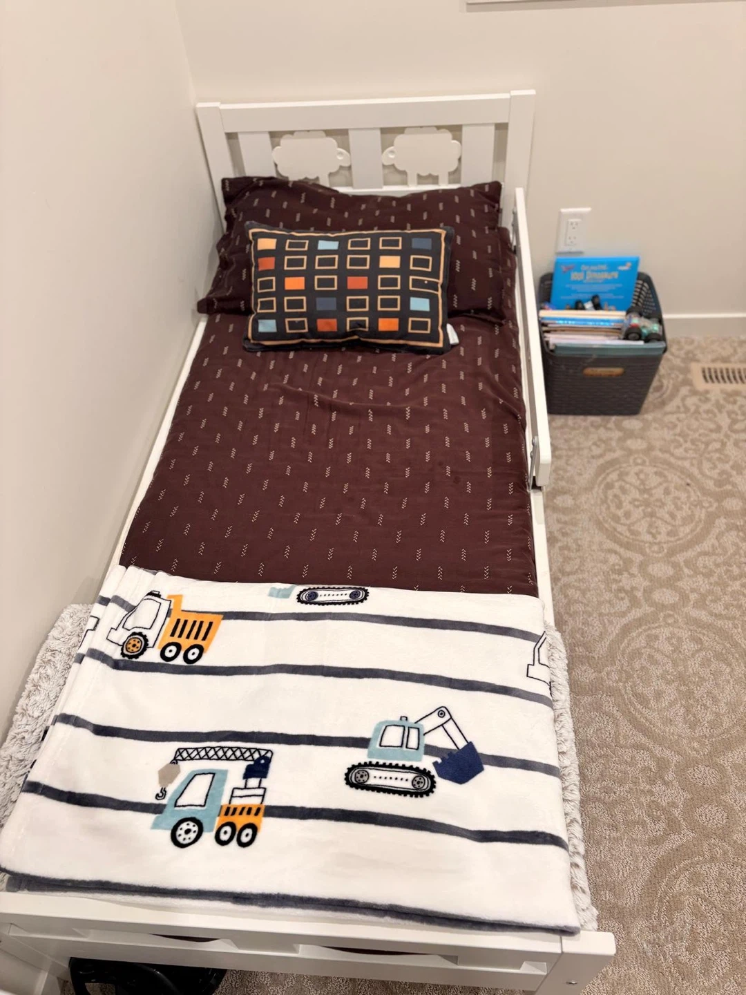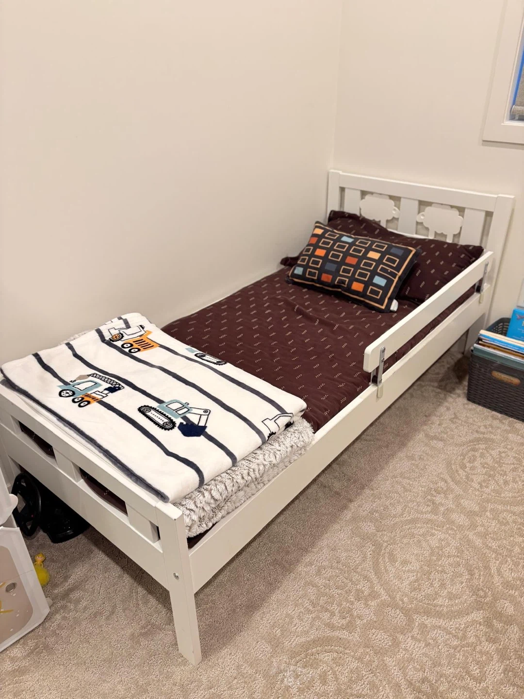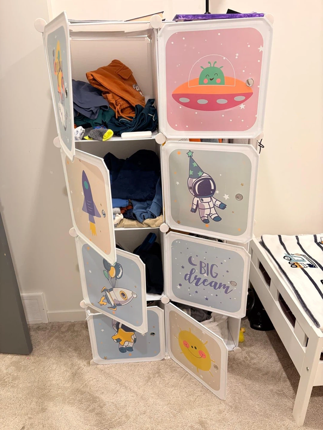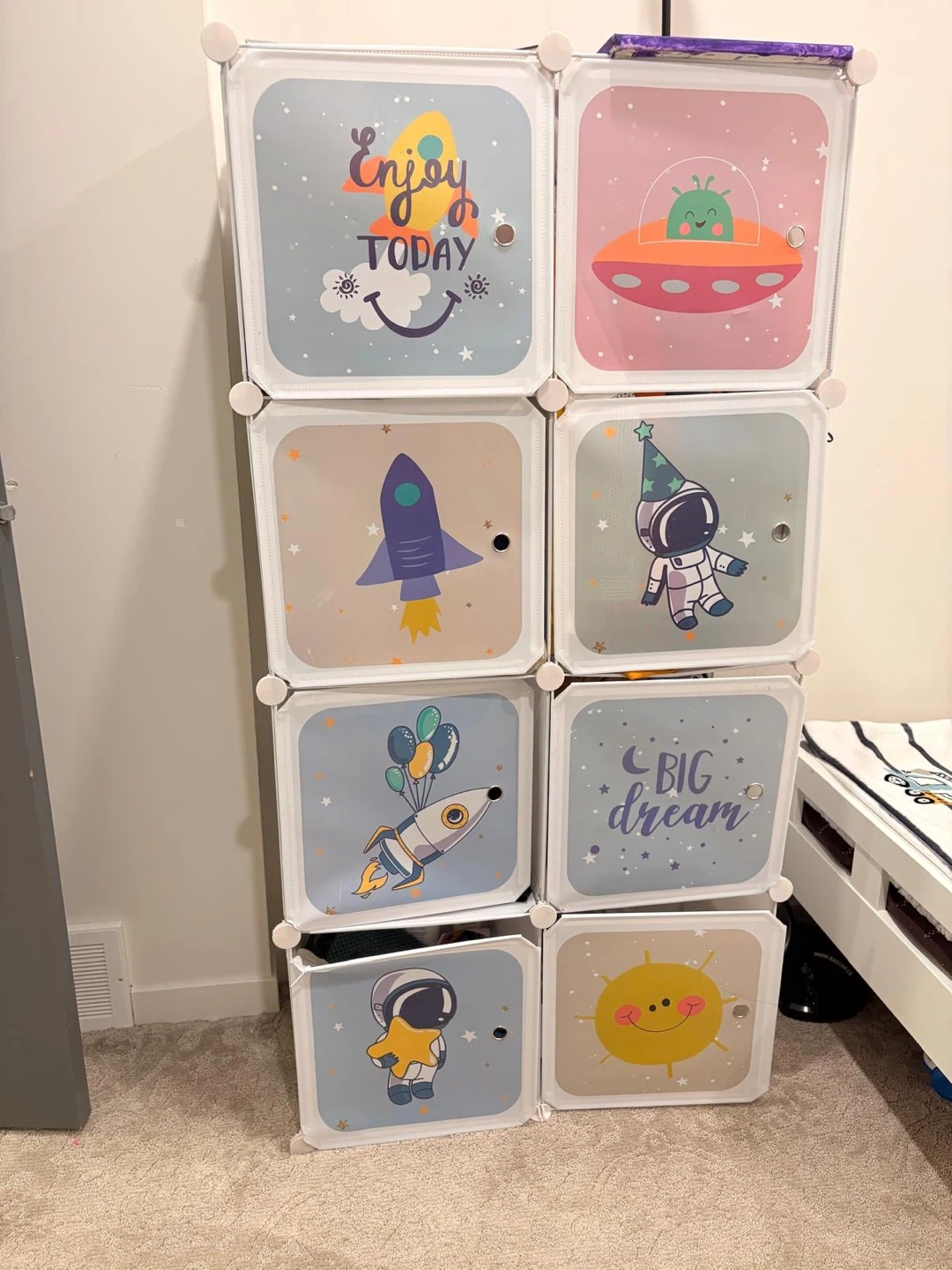 Selling a fun cube storage unit with cute space-themed designs! It's perfect for organizing toys and clothes in a kid's room. Also including a toddler bed, great for transitioning from a crib. Both items are in good condition and ready for a new home! The mattress is included.