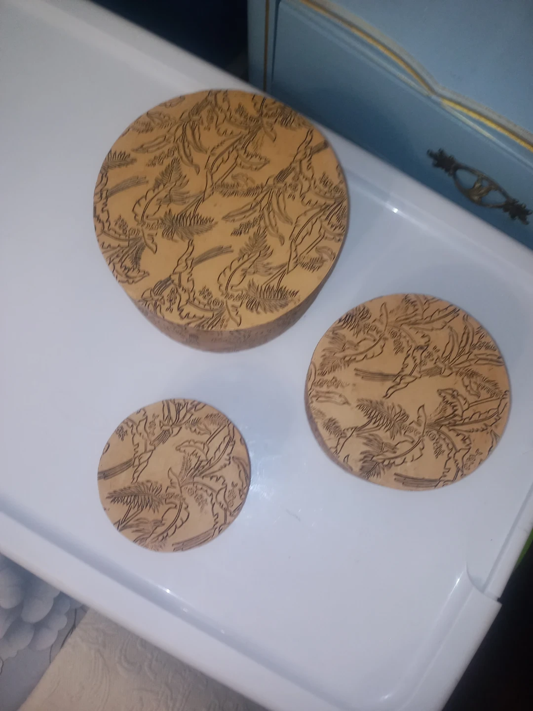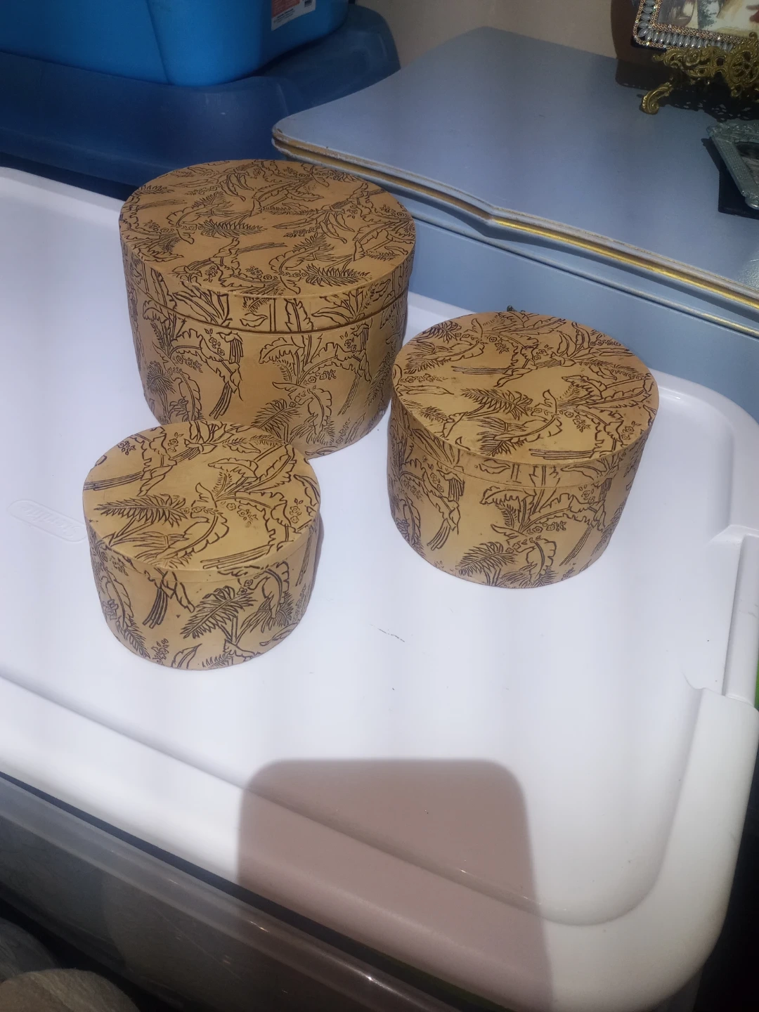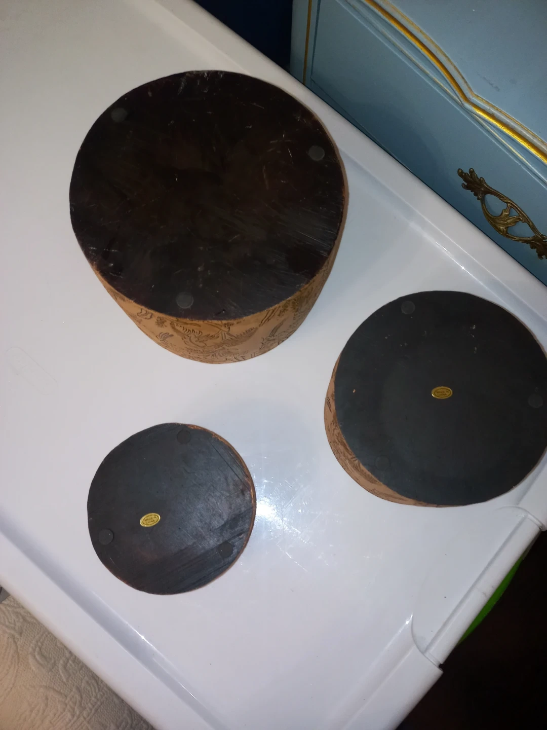 The Large and Medium containers are like New the Small one has a hair line crack but it's not that noticable or affects the container in any way. They are heavy containers. $12 for all 3 containers. See all pictures provided. Measurements are: Large - 7" 1/2 inches in Diameter 5" 1/2 inches in Height. Medium - 6" inches in Diameter 4" inches in Height. Small - 4" 3/4 inches in Diameter 3" inches in Height. Check out my other listings.
