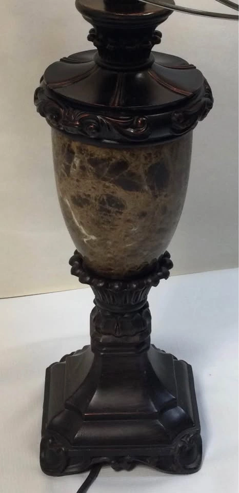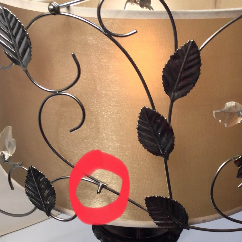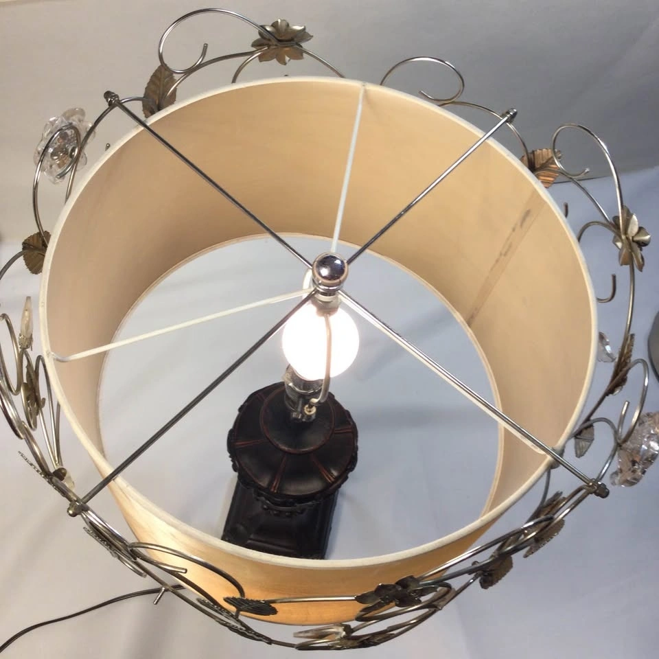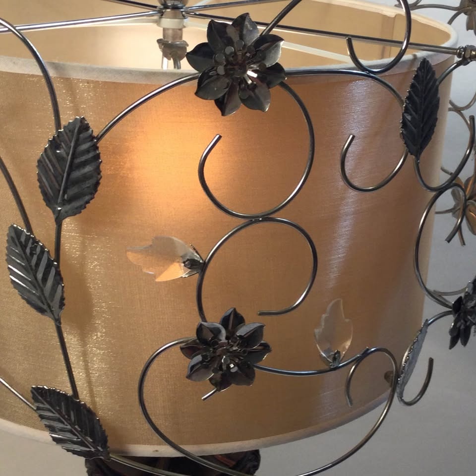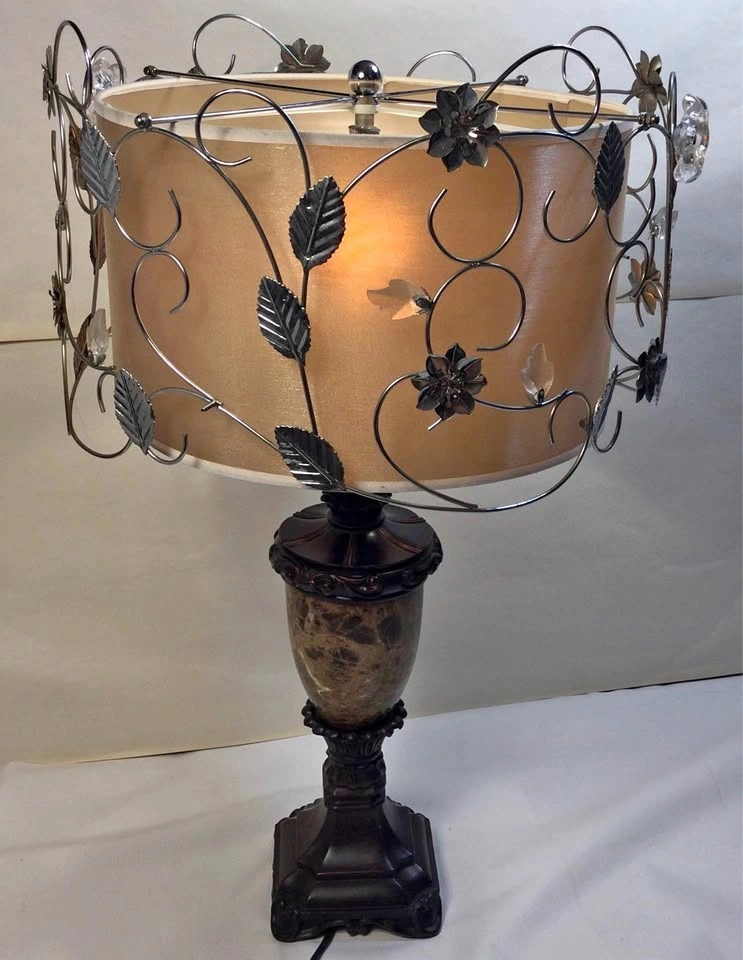 This beautiful table lamp features a unique dual-shade design, where floral wires intricately wrap around the outer shade, mimicking the graceful appearance of vines. The inner shade provides a soft, diffused light. The design includes faux crystals, florals and metal leaves.