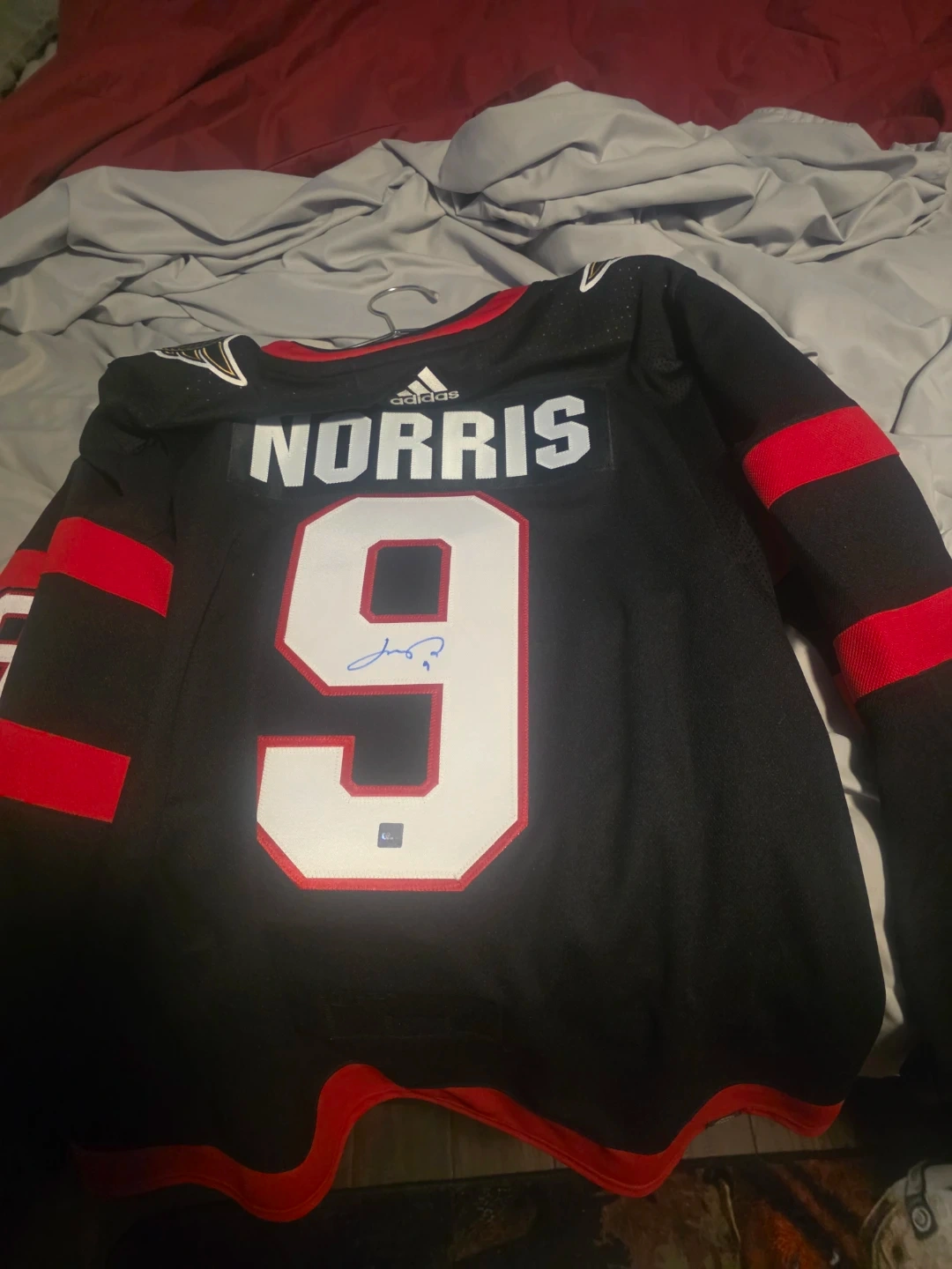 Selling an Adidas Ottawa Senators jersey featuring Josh Norris's name and number 9. The jersey is black with red accents and the Senators logo on the front. It's in great condition and ready for a new fan!