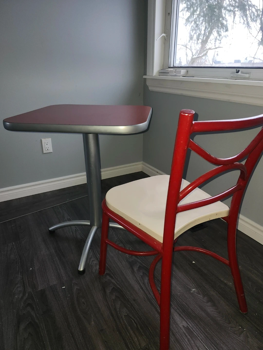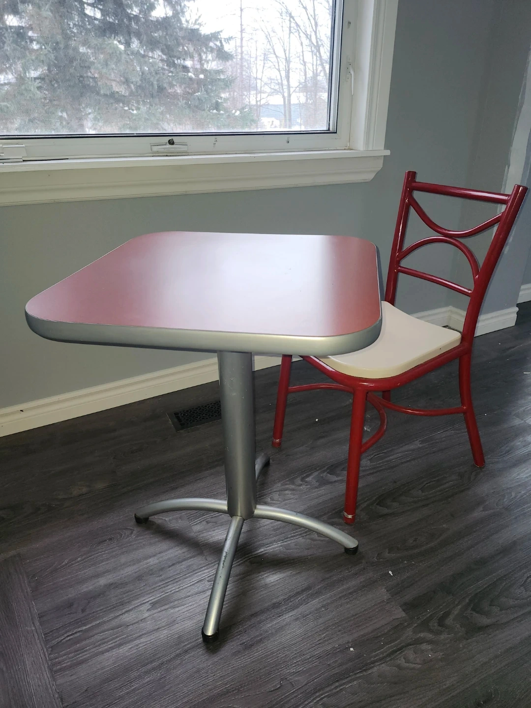 Selling a cute red table and chair set! The table has a silver base, and the chair has a cream-coloured seat. Great for a small space or breakfast nook