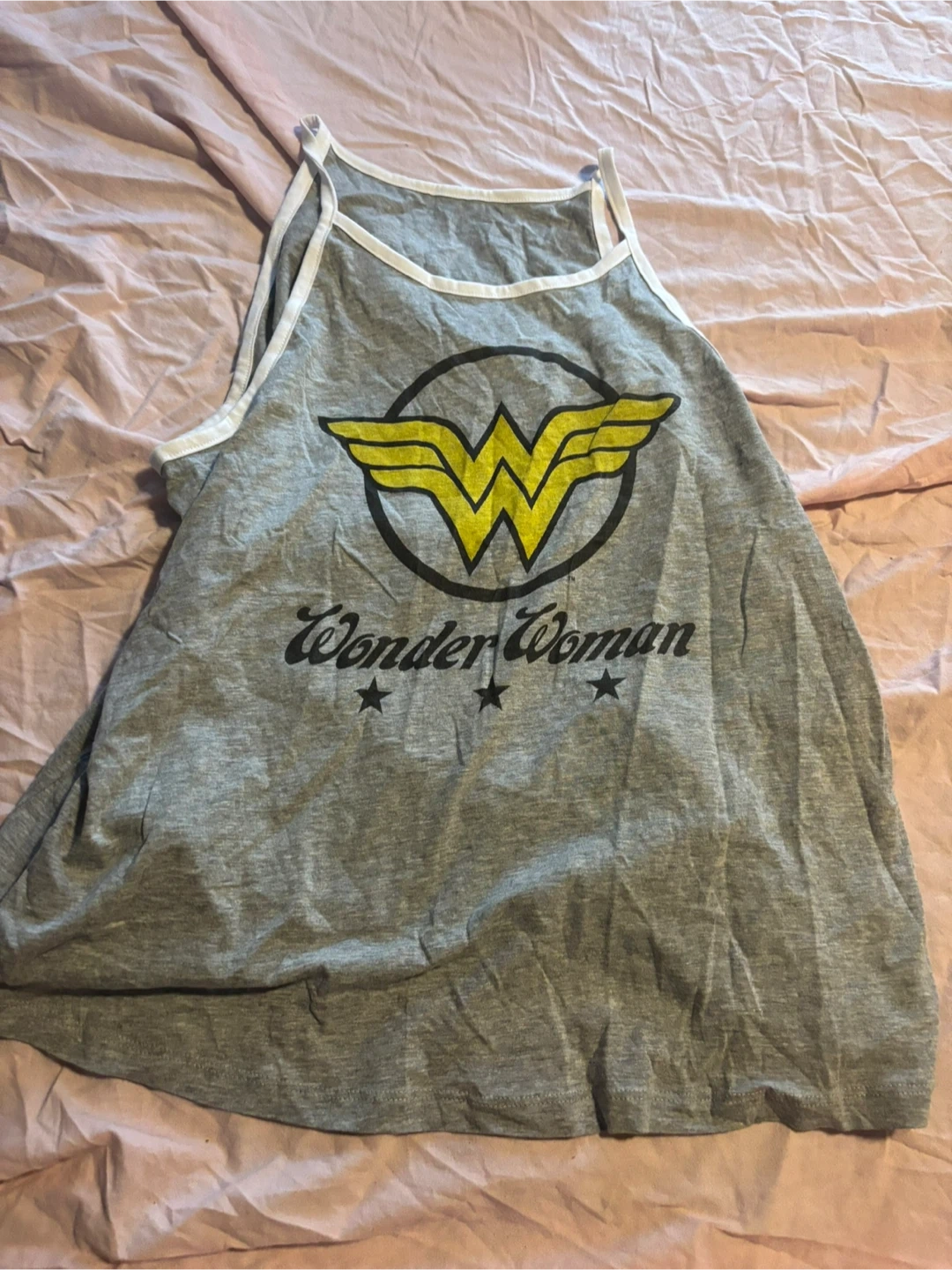 Selling a grey Wonder Woman tank top in size large! It's made of 85% cotton and 15% viscose. This tank top is perfect for casual wear or showing off your love for Wonder Woman